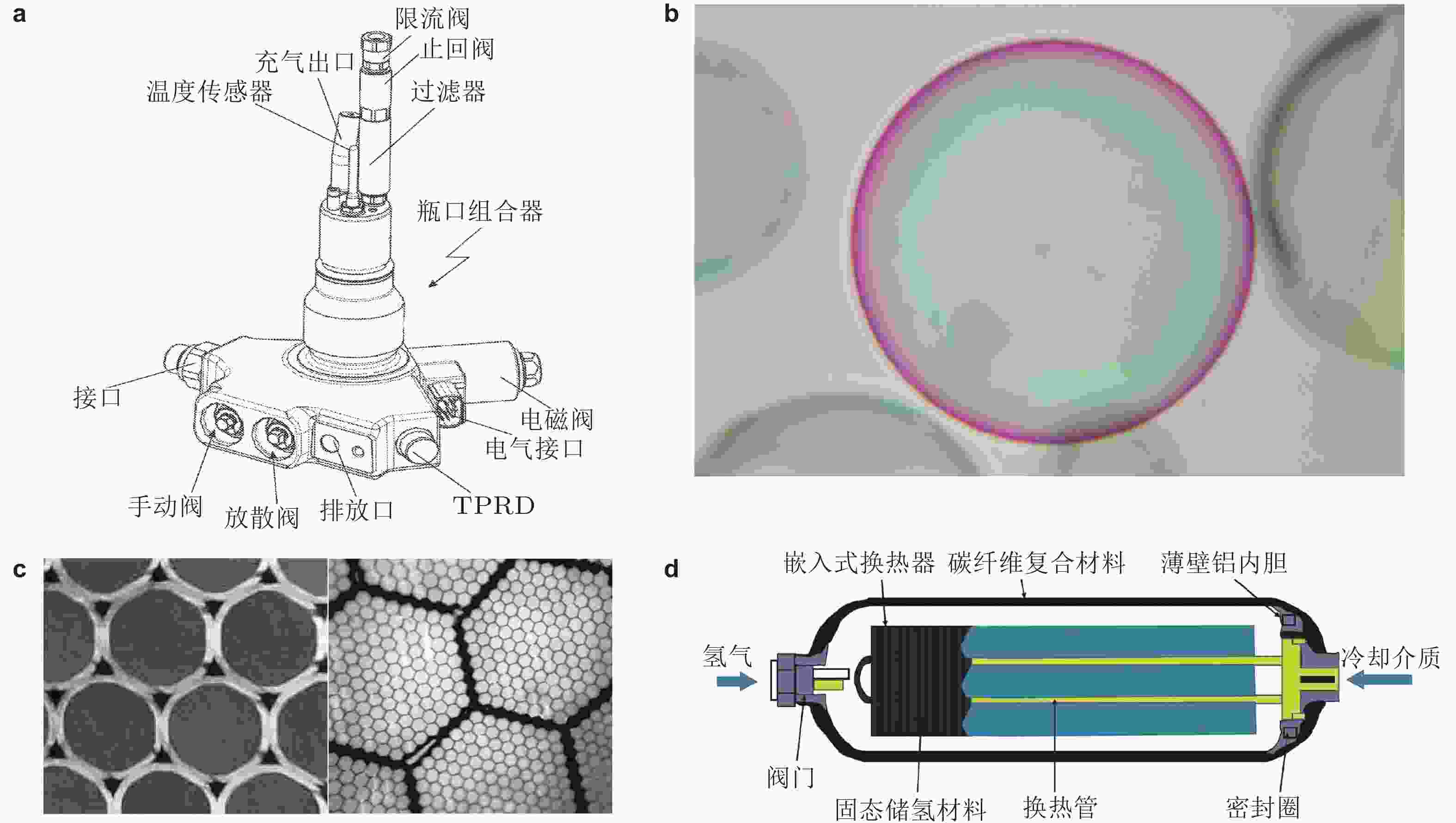 图 11 (a)瓶口组合阀组合形式(Hausmann 2021); (b)单个空心玻璃微球(Kohli et al.2008); (c)圆柱体和六角形微管阵列(Zhevago & Glebov 2007); (d)高压−固态复合气态储氢罐结构 (蒲亮 等 2022)