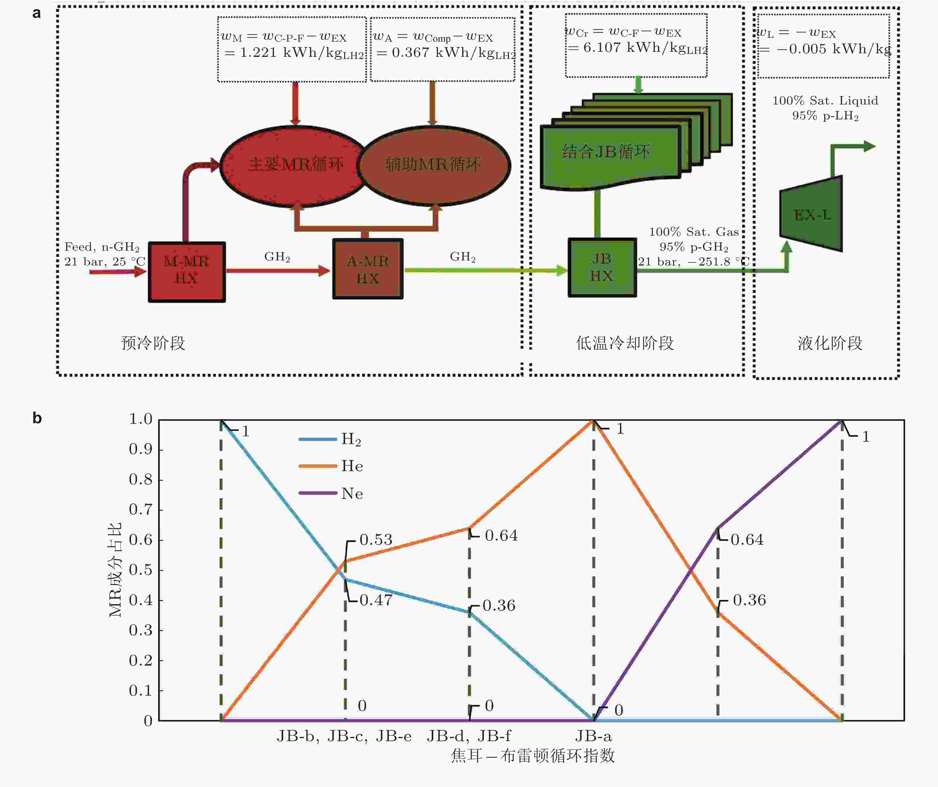 图 12 (a)结合了MR制冷系统以及MR-H2焦耳−布雷顿级联制冷系统, (b)设备低温段JB循环流的MR组成(Asadnia & Mehrpooya 2017)