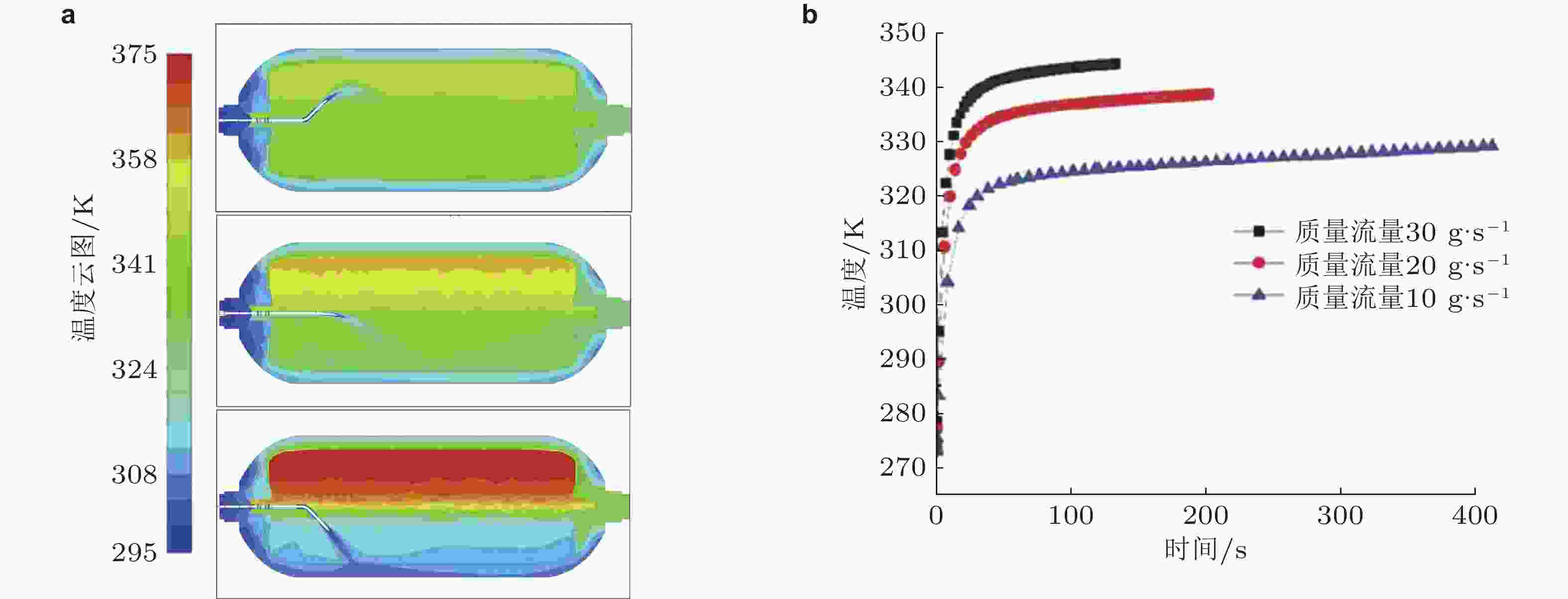 图 14 (a)充气过程结束时喷注器向上、垂直和向下(直径6 mm)时的温度场(Melideo et al. 2019), (b)不同充氢质量流量下氢气温度的变化(何青和胡华为 2022)