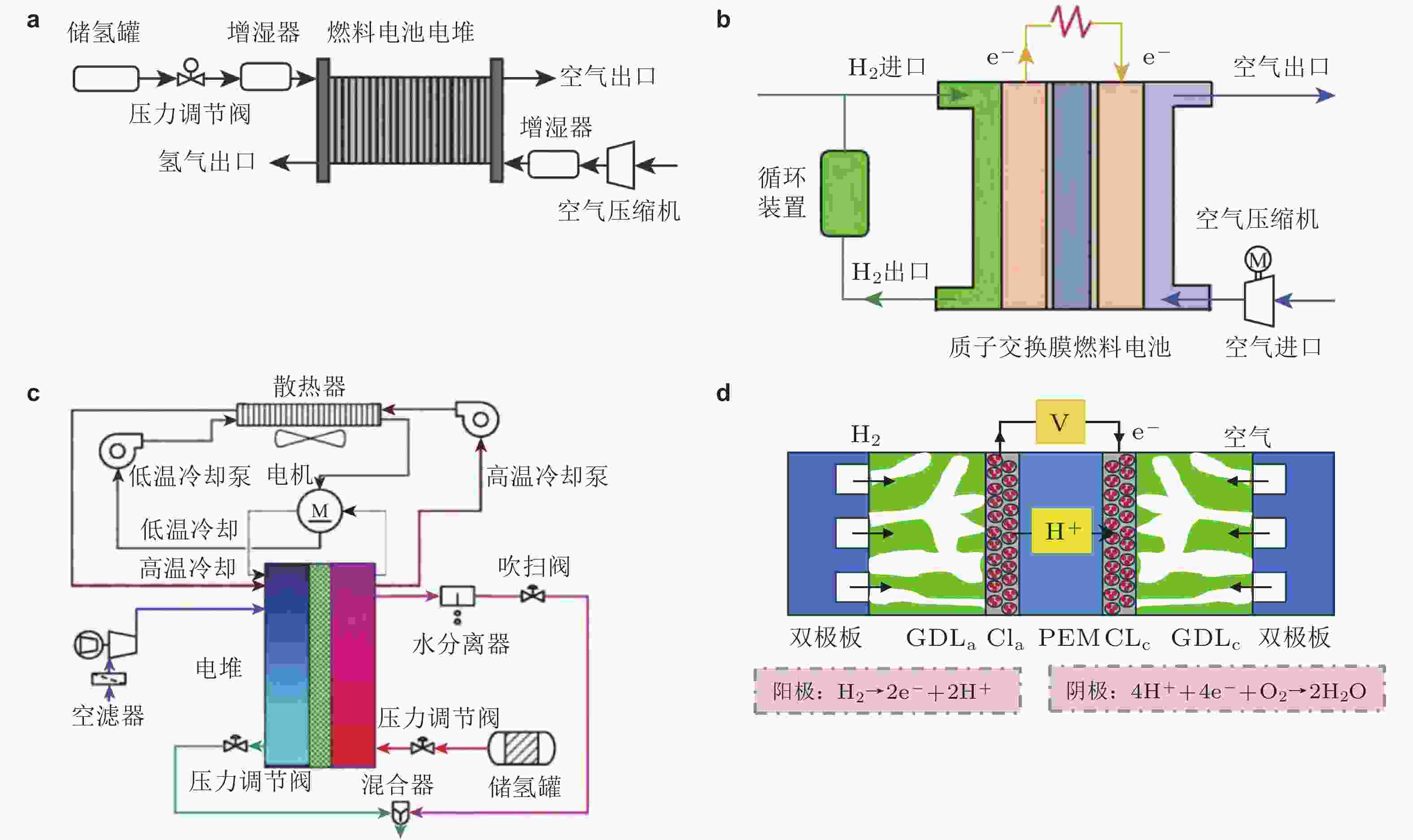 图 15 (a)直排流通模式; (b)再循环模式; (c)死端模式(Ahluwalia & Wang 2008, 张立新 等2022); (d) PEMFC结构及工作原理示意