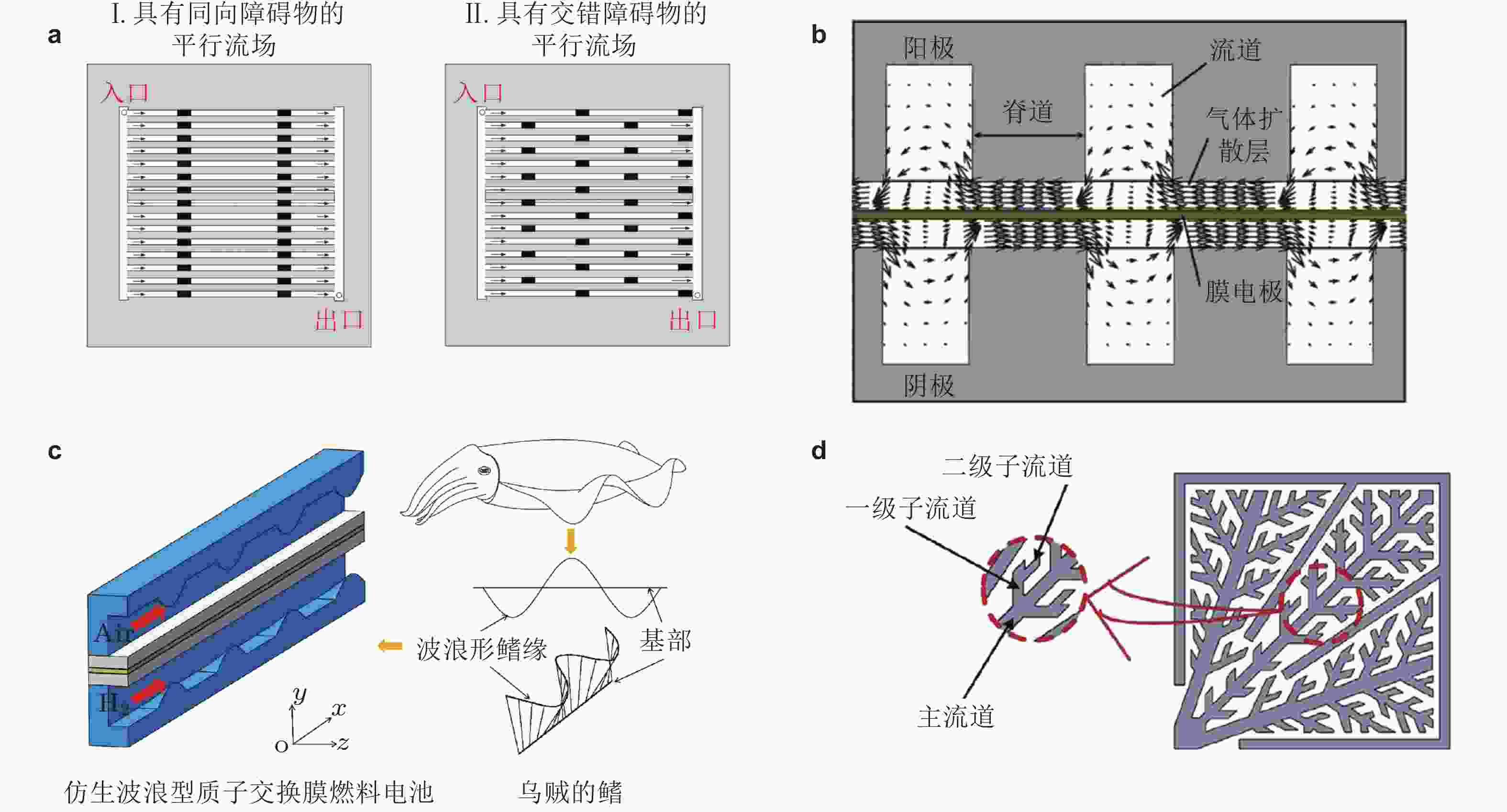 图 16 (a)不同肋板位置排布的阴极侧流道结构(Heidary et al. 2017); (b)肋下通过气体扩散层的对流(Wilberforce et al. 2019); (c)波浪形仿生结构流道(Cai et al. 2020); (d)叶脉形仿生结构流道(Ouellette et al. 2018)