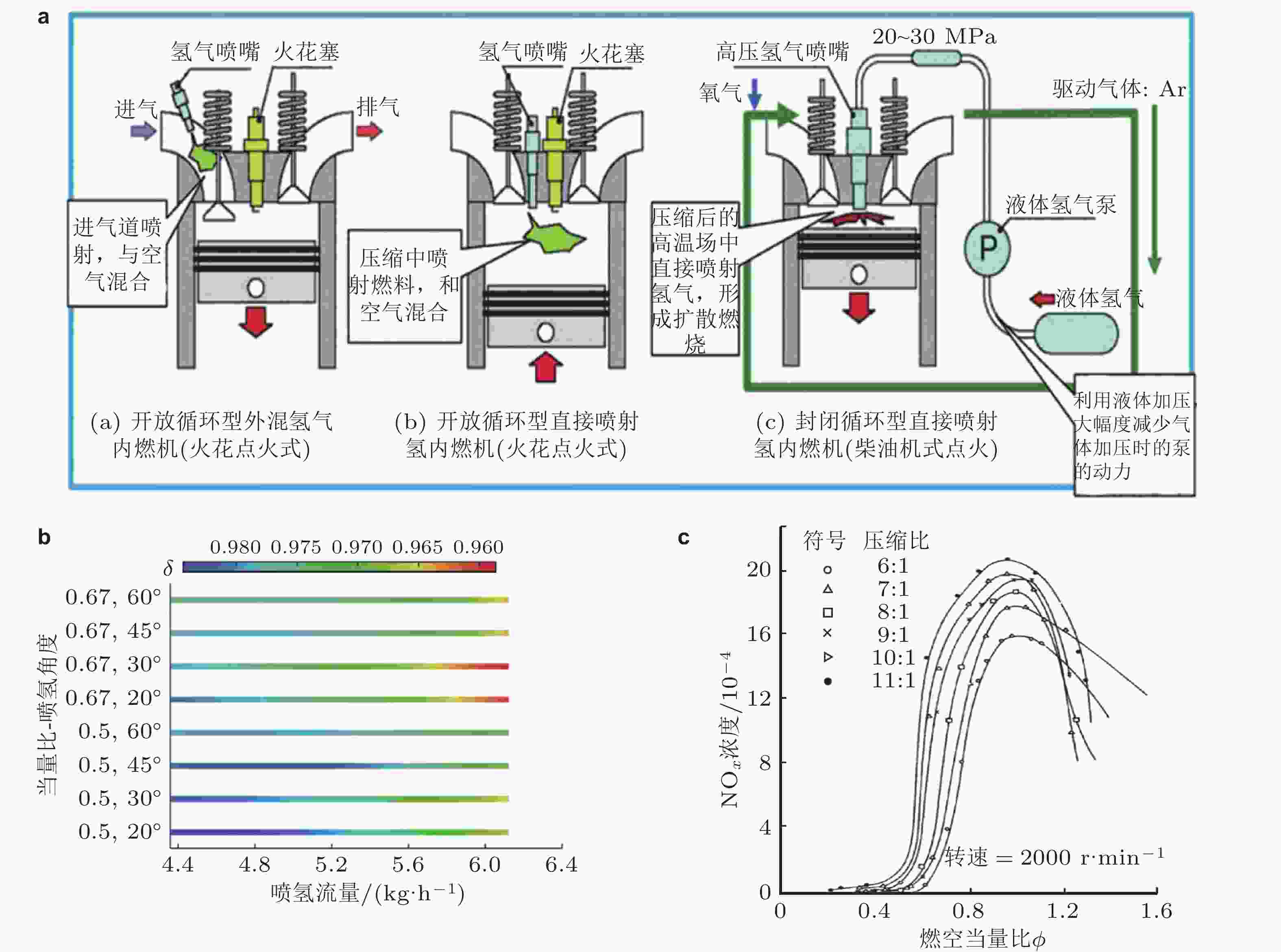 图 18 (a)缸内直喷氢内燃机的3种燃烧模型(李星国 2023), (b)混合气均匀性系数随喷氢流量的变化(杨振中 等 2022), (c)不同压缩比匀速压缩下, NOx排放量随燃空当量比的变化(Jilakara et al. 2015)