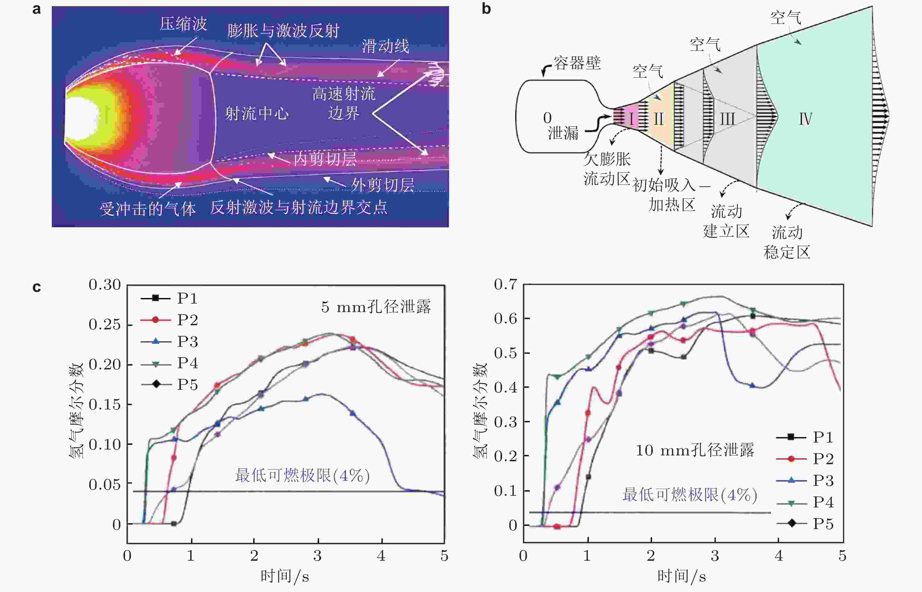 图 19 (a)高压欠膨胀射流激波结构示意(Wilkes et al. 2008), (b)高压欠膨胀射流发展过程(Li et al. 2021), (c)不同工况、不同孔径下监测点氢气浓度变化(赵泽滢 2022)