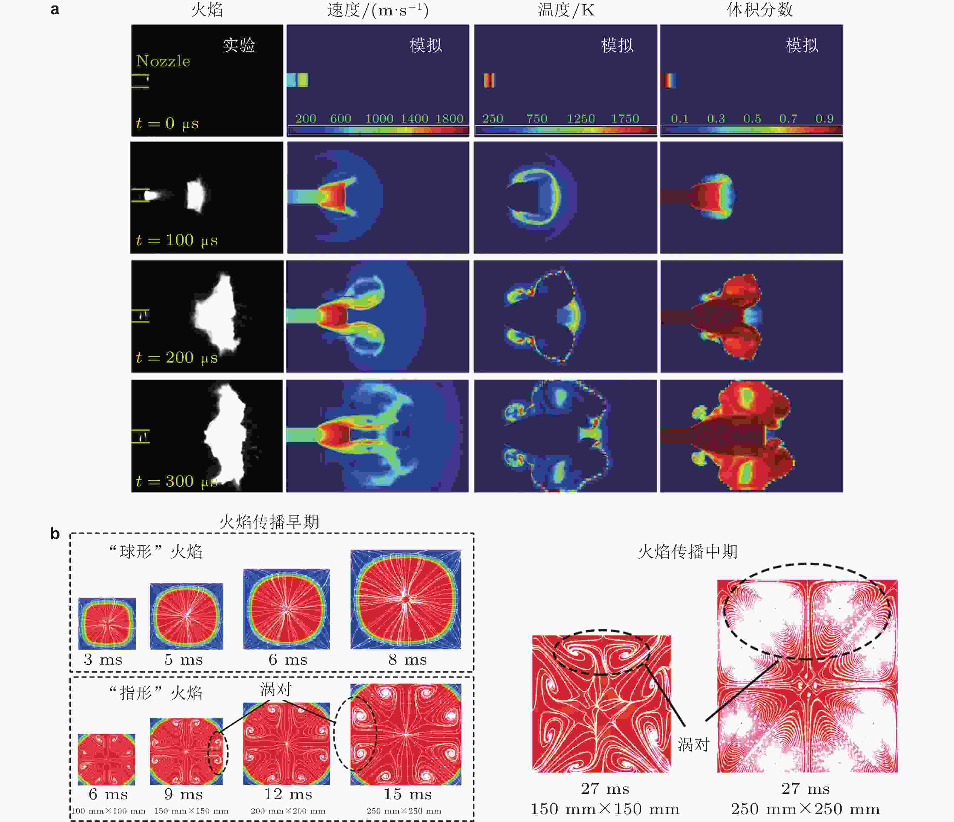 图 20 (a)环形涡旋结构的发展过程(Wang et al. 2020), (b)截面尺寸对火焰传播速度的影响: 早/中期二维火焰面切片流场(周宁 等 2020)