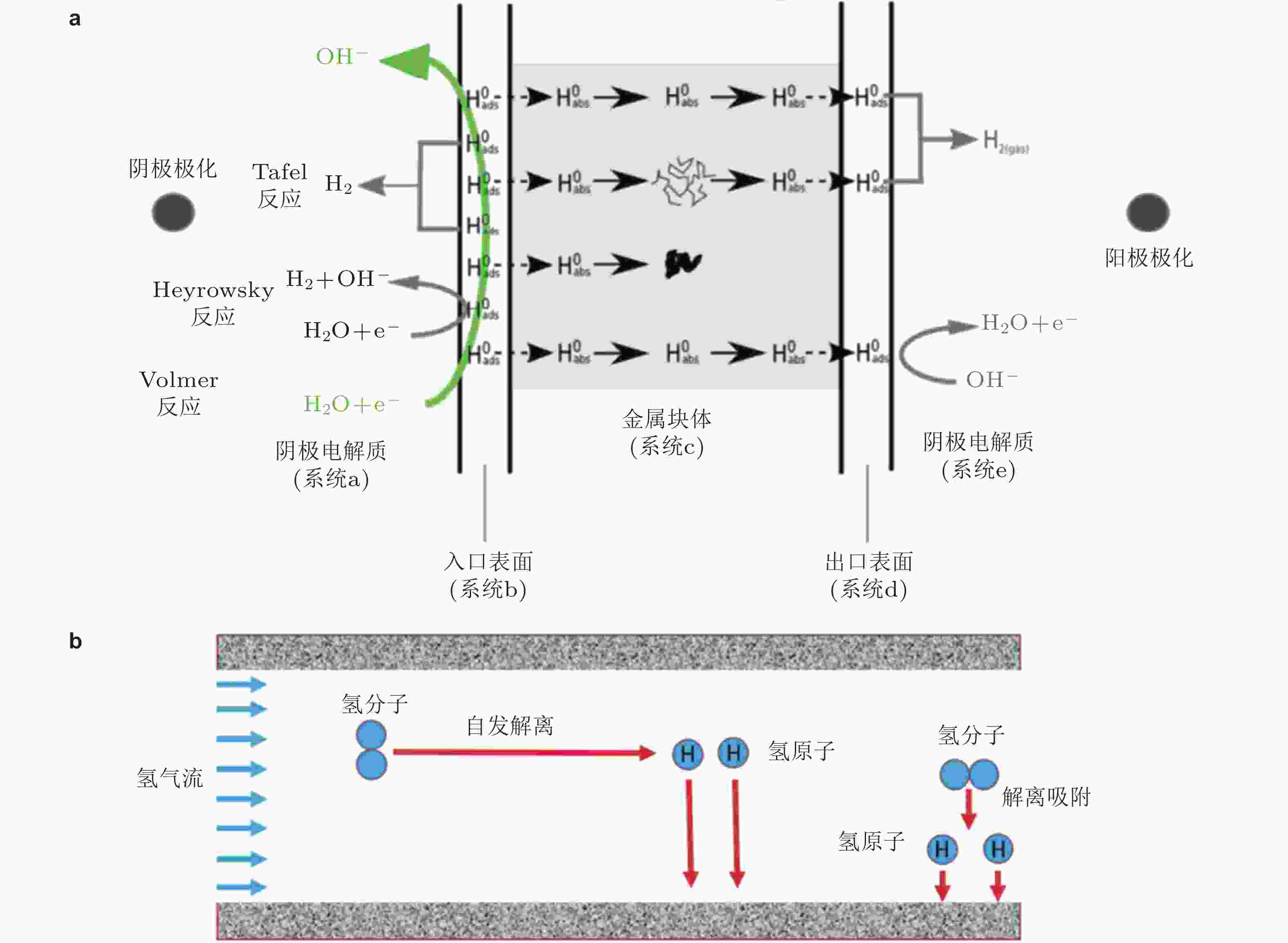 图 21 氢吸附及渗透过程. (a)液相电化学阴极极化充氢及氢原子渗透过程示意(Vecchi et al. 2018), (b)氢气管道表面可能存在的两种氢原子产生机理示意(Sun & Cheng 2021a)
