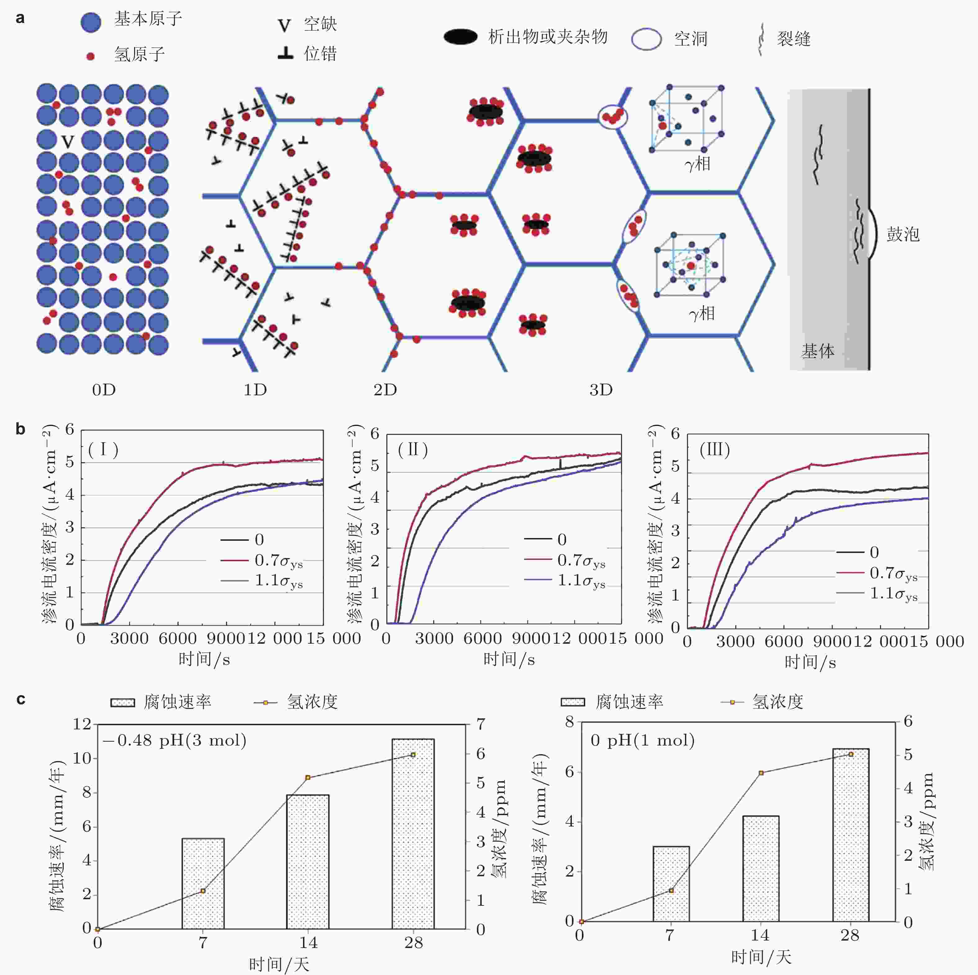 图 22 (a)钢的各种氢捕获位置(刘神光 等 2020), (b)同应力下X80钢焊件(Ⅰ)热影响区、(Ⅱ)基钢、(Ⅲ)焊缝金属不同区域的电化学氢渗透电流曲线(Sun & Cheng 2021b), (c)腐蚀速率和氢气浓度的关系(Wasim & Djukic 2020)