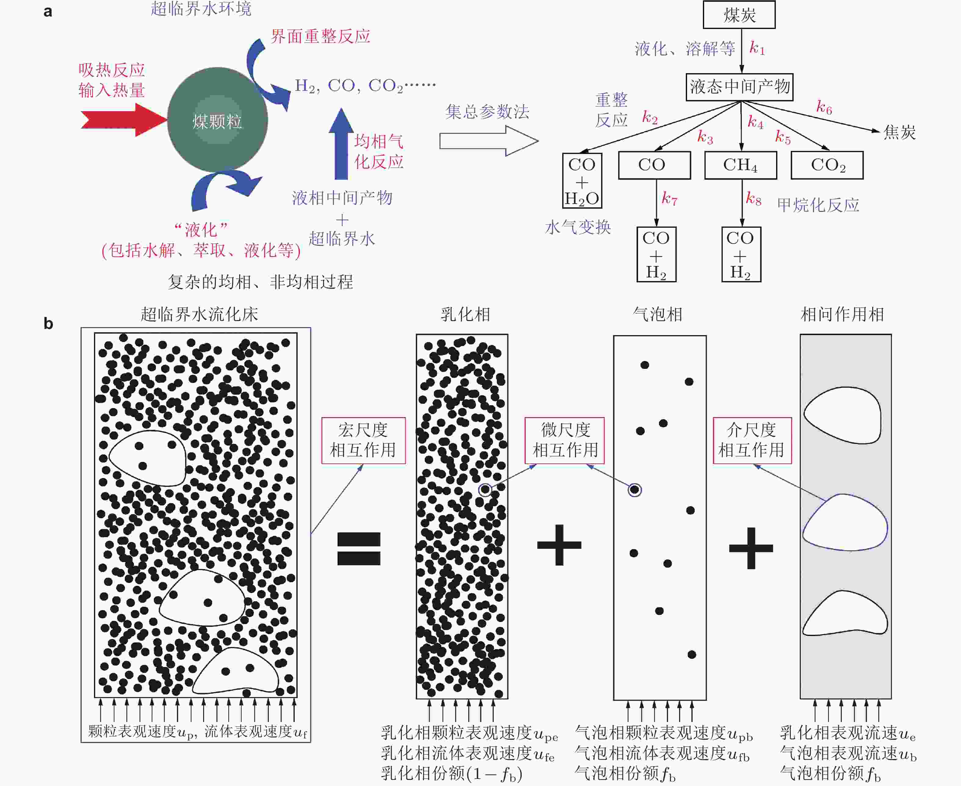 图 4 煤炭超临界水气化制氢反应机理(Hui et al. 2015, 吕友军 等 2022). (a)煤炭超临界水气化制氢主要物理、化学过程、集总参数模型示意; (b)超临界水流态化分解示意