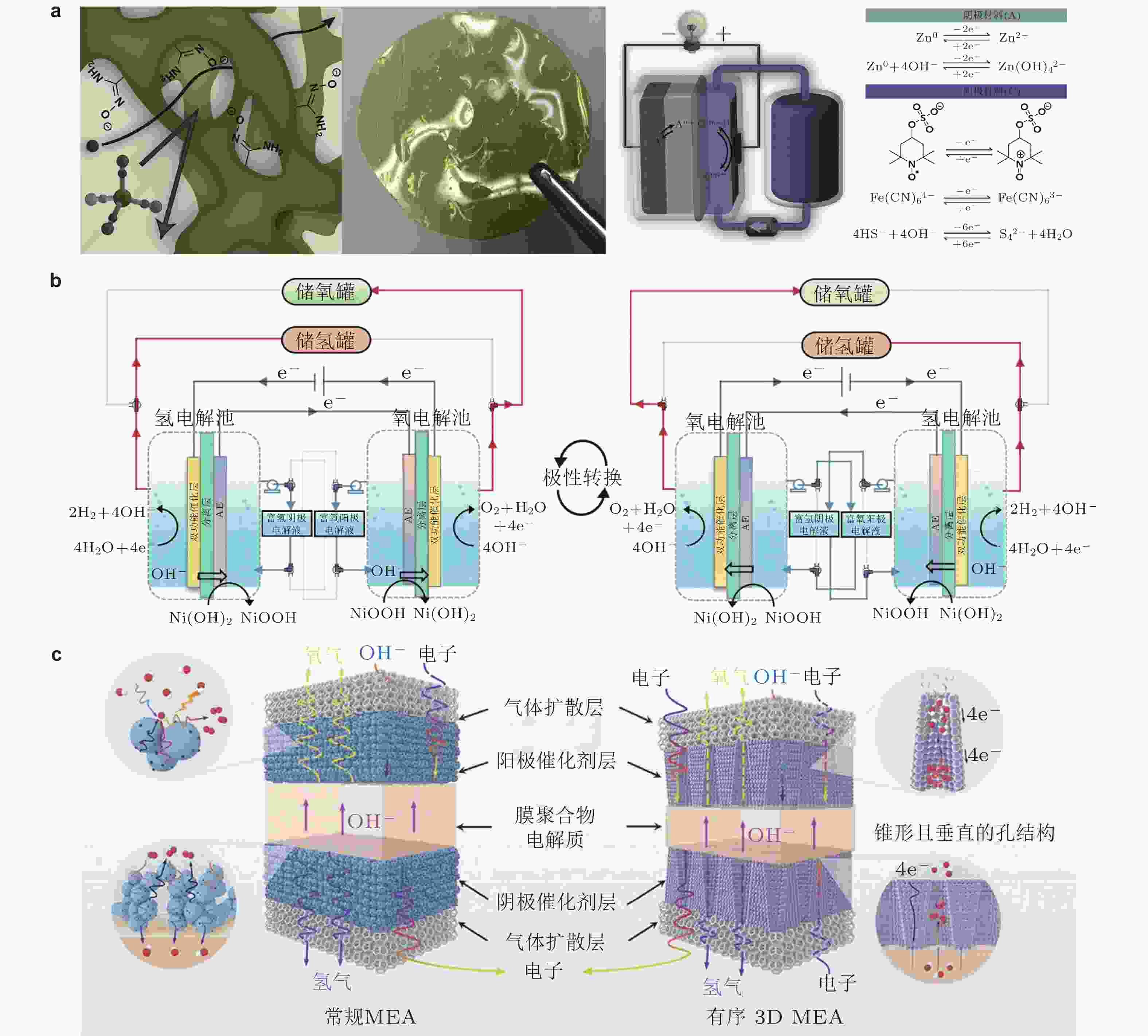 图 7 不同类型电解池设计理念. (a)离子选择性AquaPIM膜及其液流电池示意图(Baran et al. 2019), (b)无电解质隔膜流动电解池工作原理(Yan et al. 2021), (c)传统膜电极与整体有序化膜电极结构设计(Wan et al. 2022)