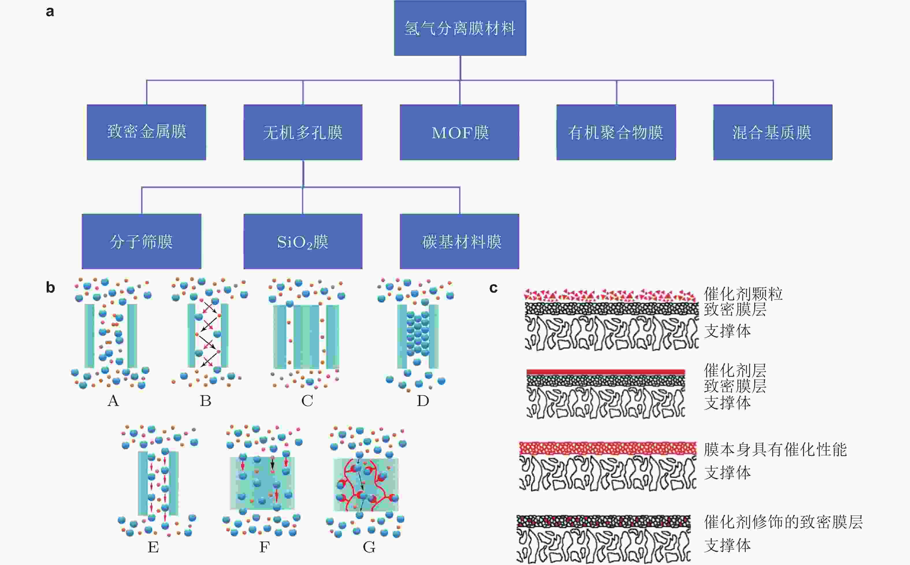 图 9 (a)氢气分离膜的分类; (b)膜内气体传输机制示意图(Li et al. 2015); (c)催化膜反应器中催化剂的几种负载方式(王金亮和黑悦鹏 2021). 注: A Poiseuille流动; B努森扩散; C分子筛分; D毛细管冷凝; E表面扩散; F溶解扩散; G促进传递