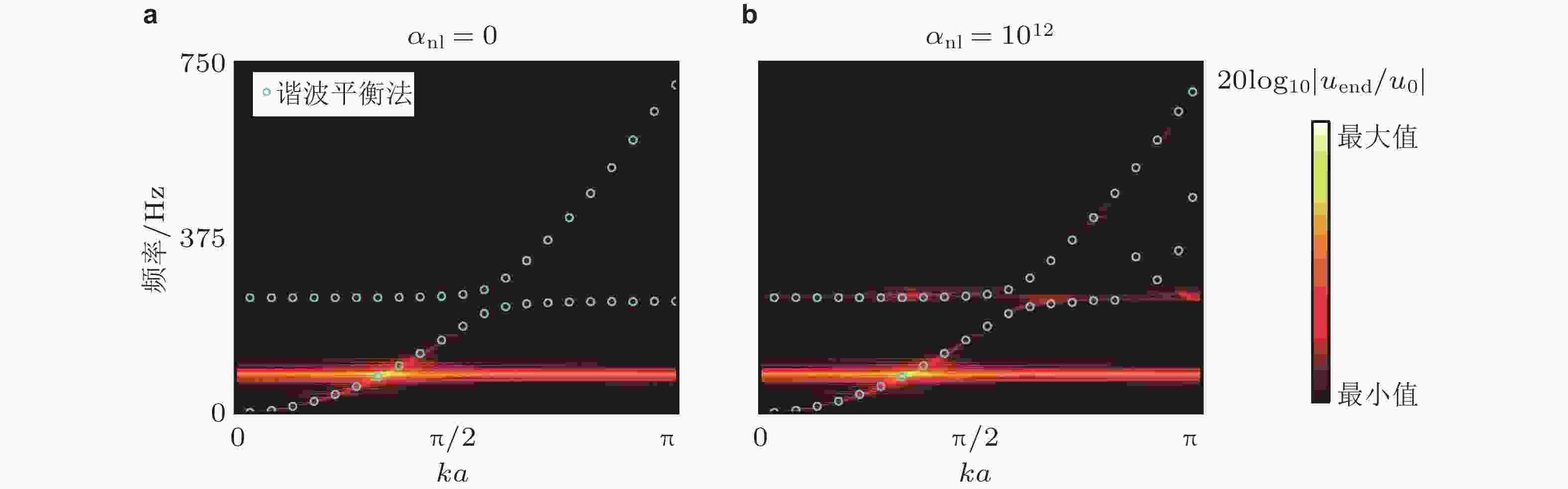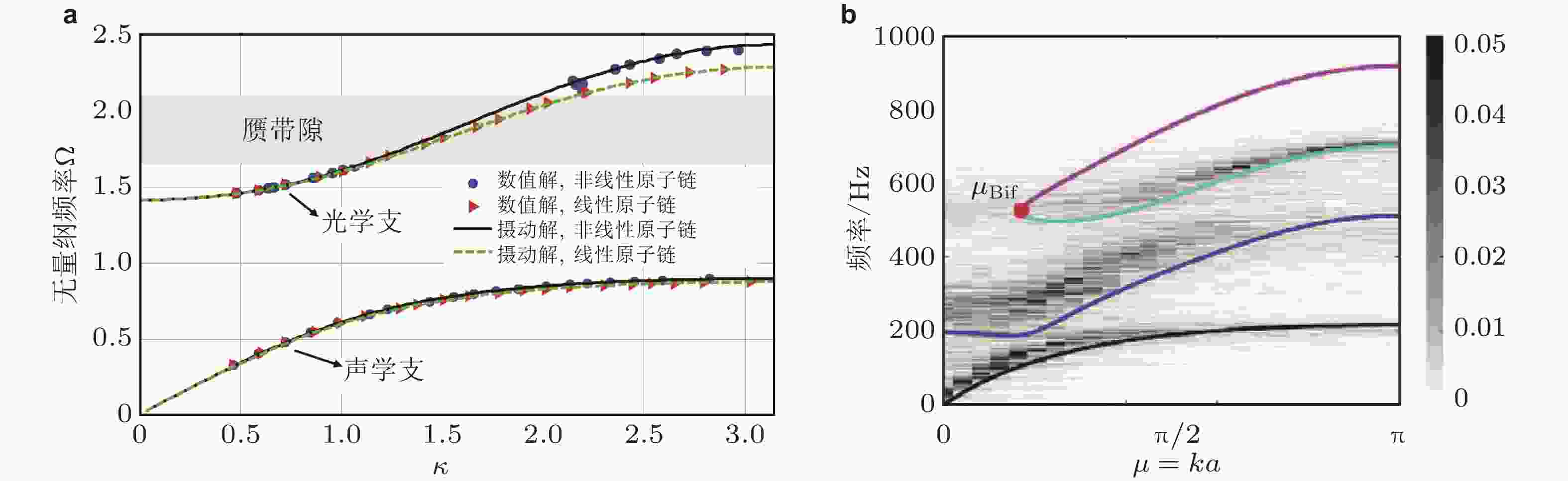 图 10 一维非线性原子链能带结构时/频域分析. (a) 弱非线性原子链(Zhou et al. 2018); (b) 强非线性原子链, 实线为谐波平衡法计算结果, 背景阴影色为时域计算获得的2D FFT结果(Gong et al. 2023)