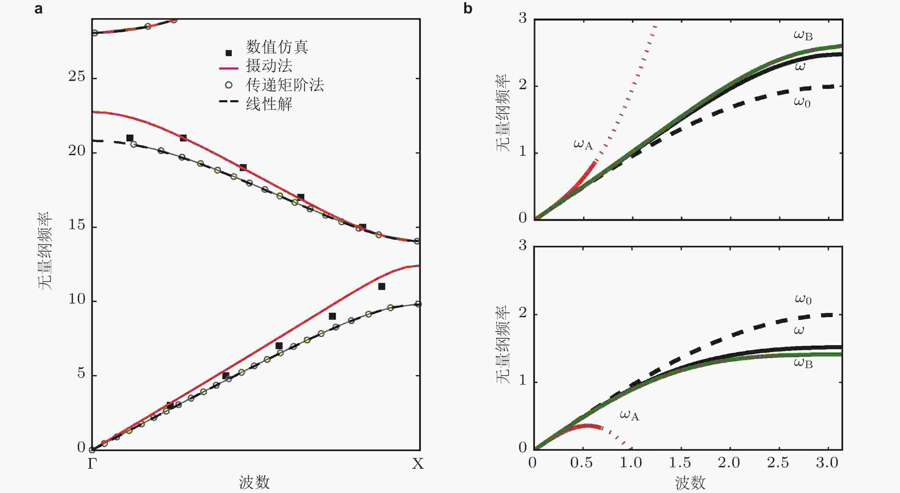 图 11 基于不同频域计算方法获得的非线性周期结构能带曲线. (a) Lindstedt-Poincaré摄动法与传递矩阵法对比(Manktelow et al. 2013a); (b) Lindstedt-Poincaré摄动法与多尺度法对比,