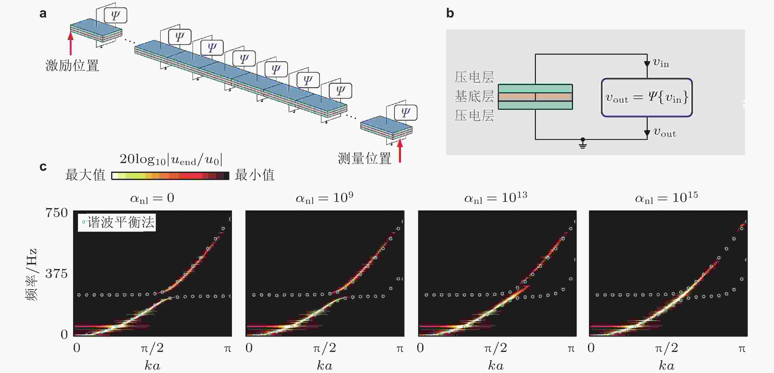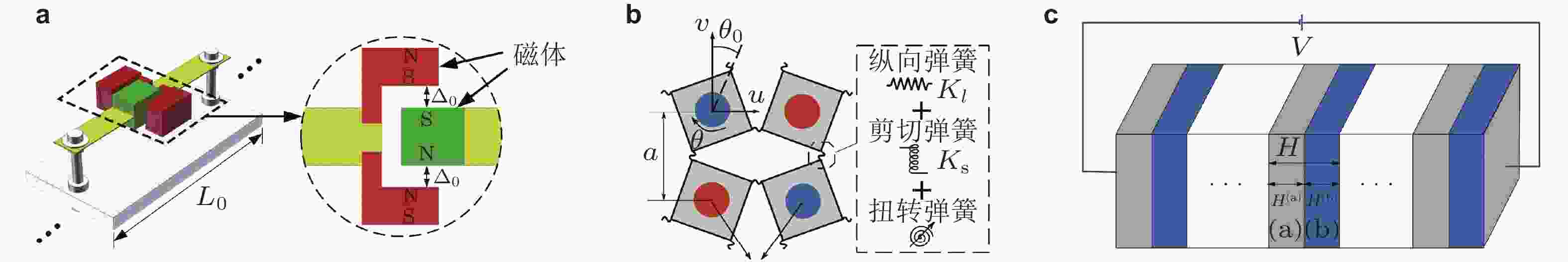 图 8 通过外界物理场引入非线性效应. (a) 具有非线性力−磁耦合作用的梁结构(Xue et al. 2023), (b) 含永磁体的柔性铰链结构(Jiao et al. 2024), (c) 由介电弹性材料构成一维周期结构(Chen et al. 2020)