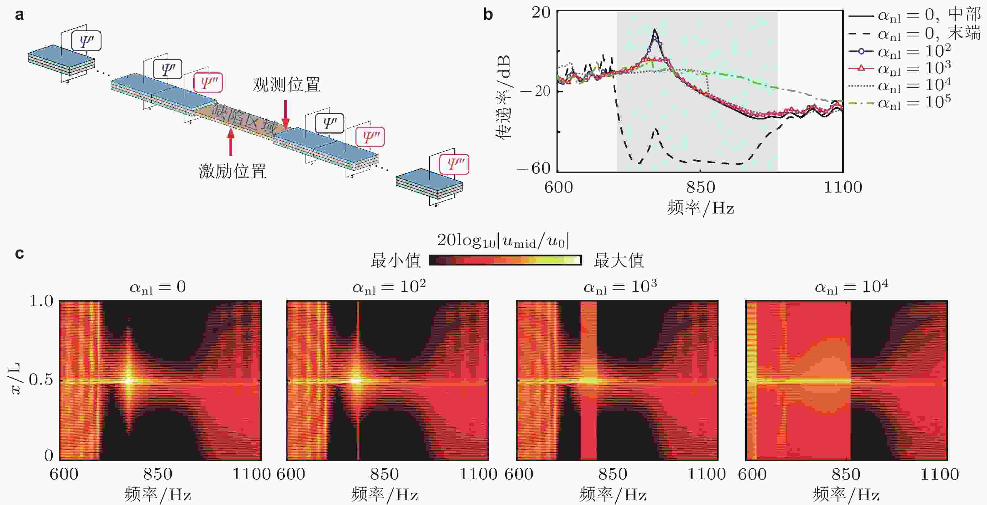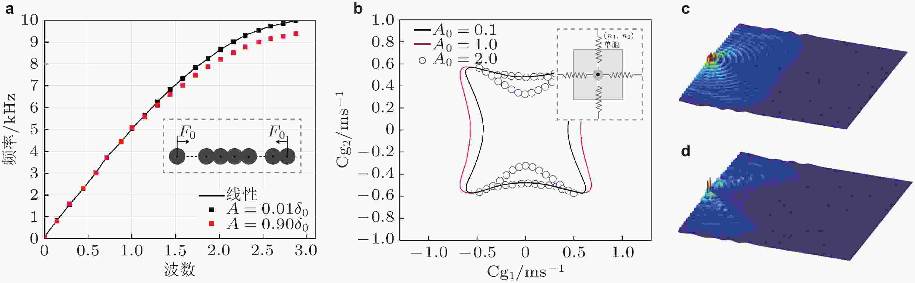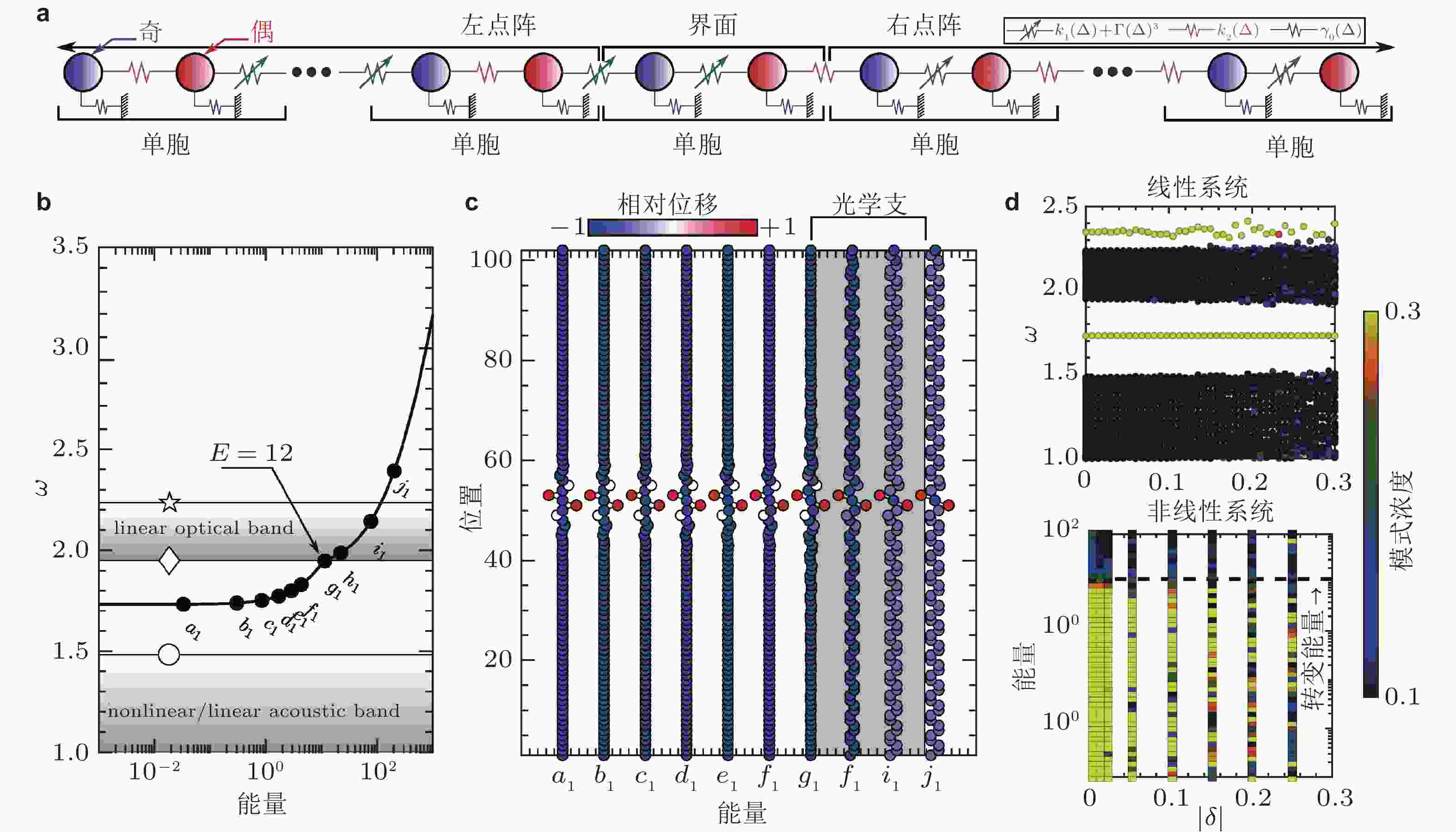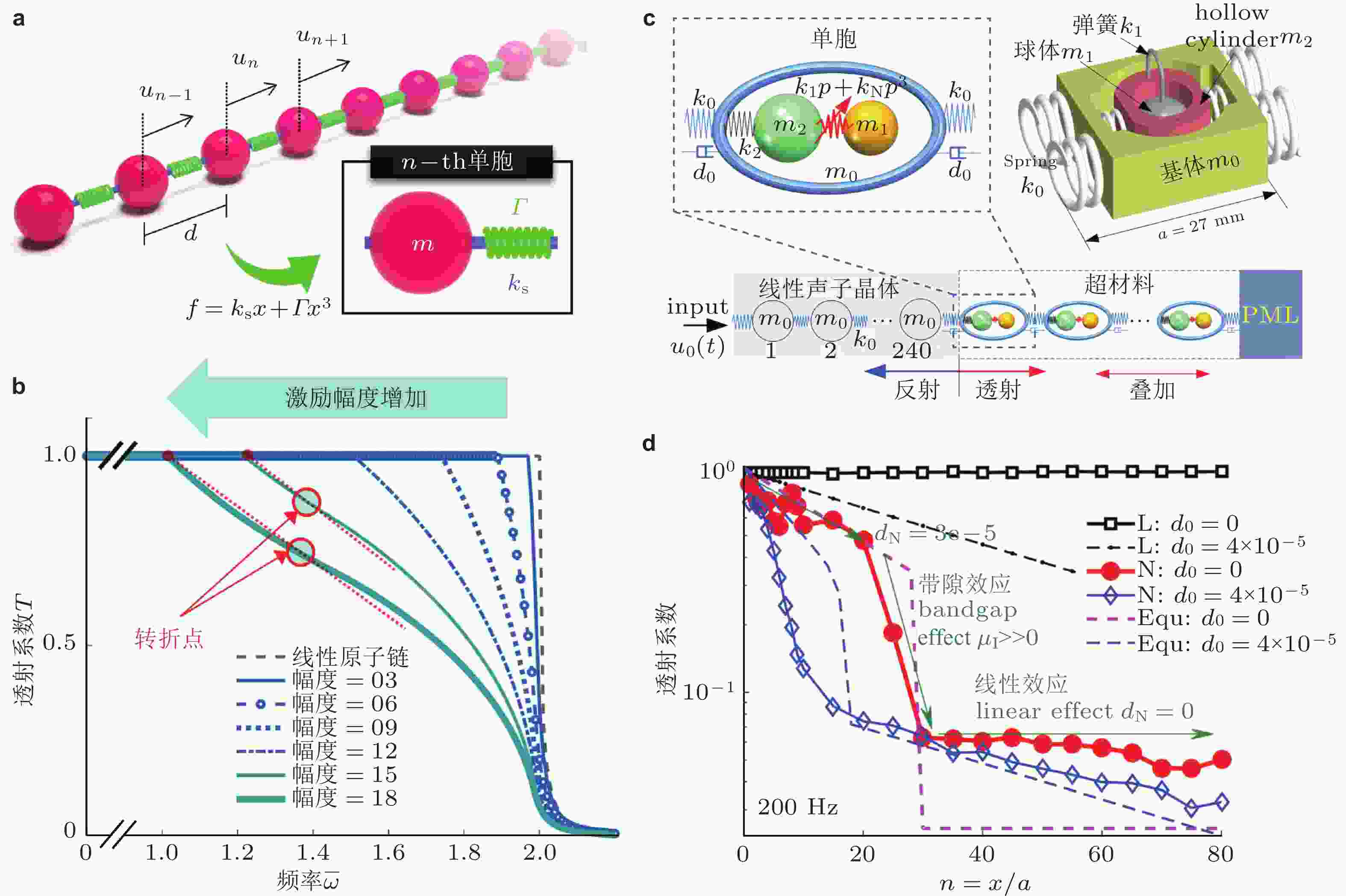 $ n = {x / a} $ 变化过程, 图例中L和N分别表示线性和非线性原子链,$ {d_0} $ 为阻尼系数. 来自文献(Bae & Oh 2020, Fang et al. 2020)图 21 通带和带隙之间频率成分转换与能量转换. (a) 左图为单频激励