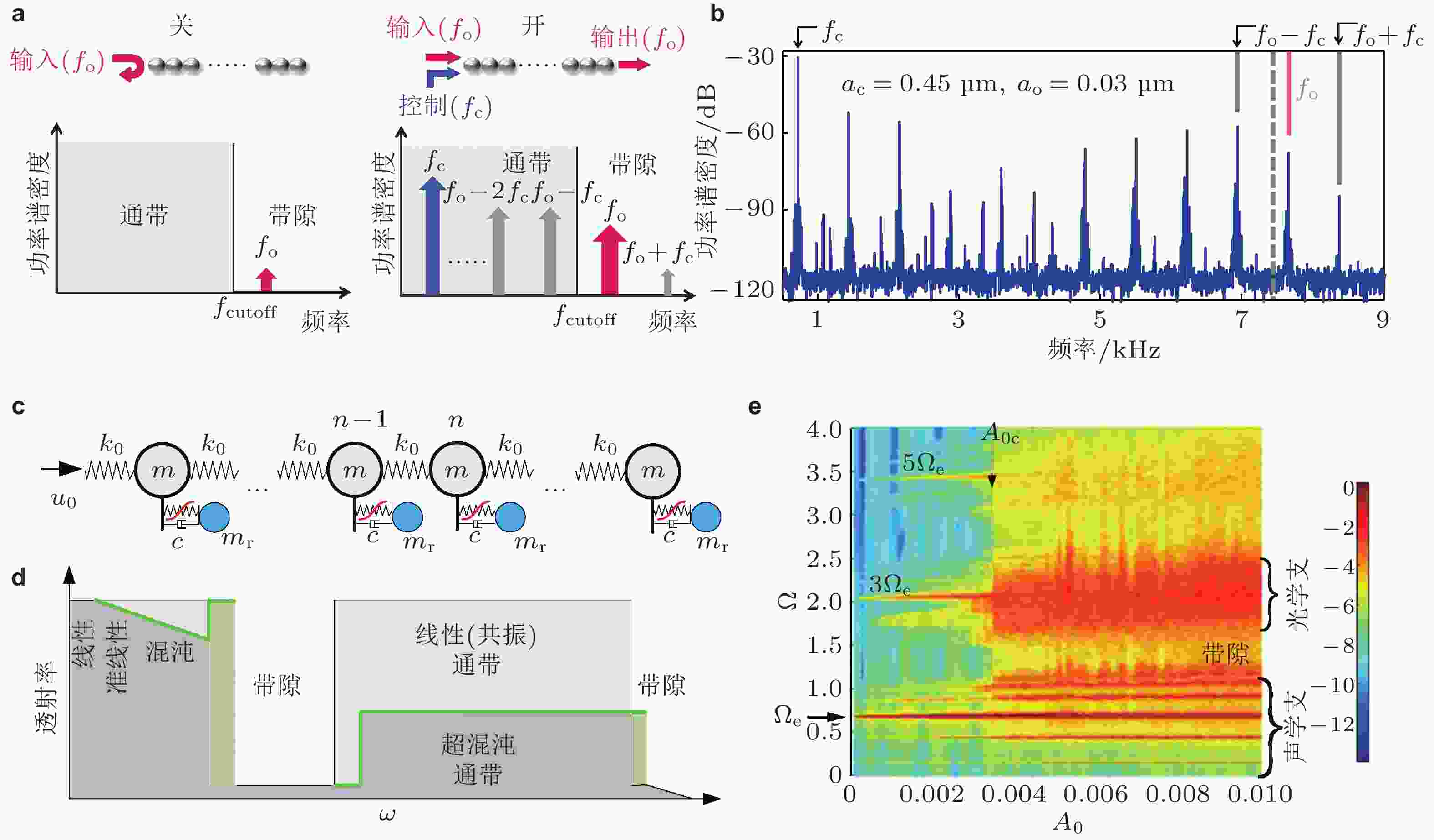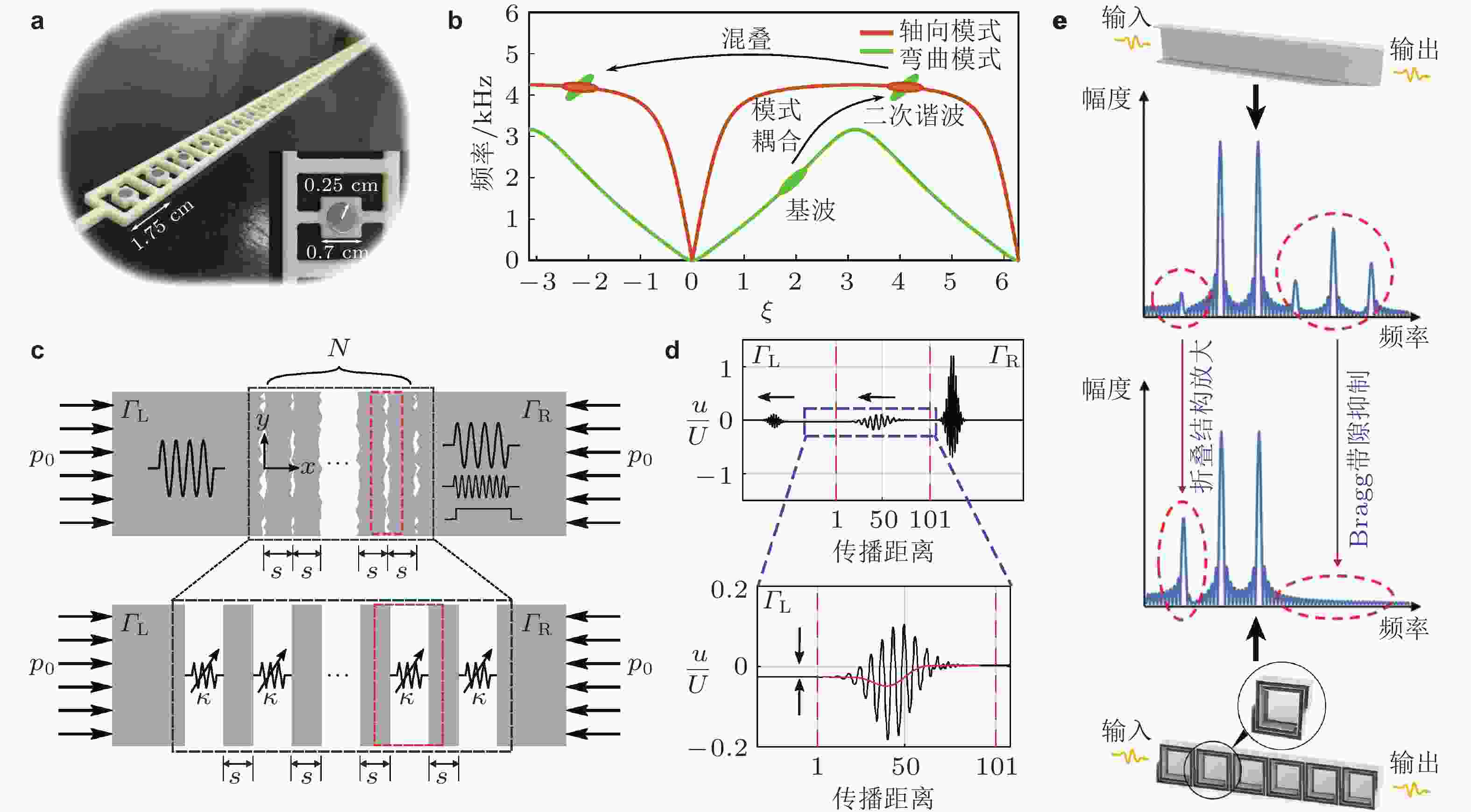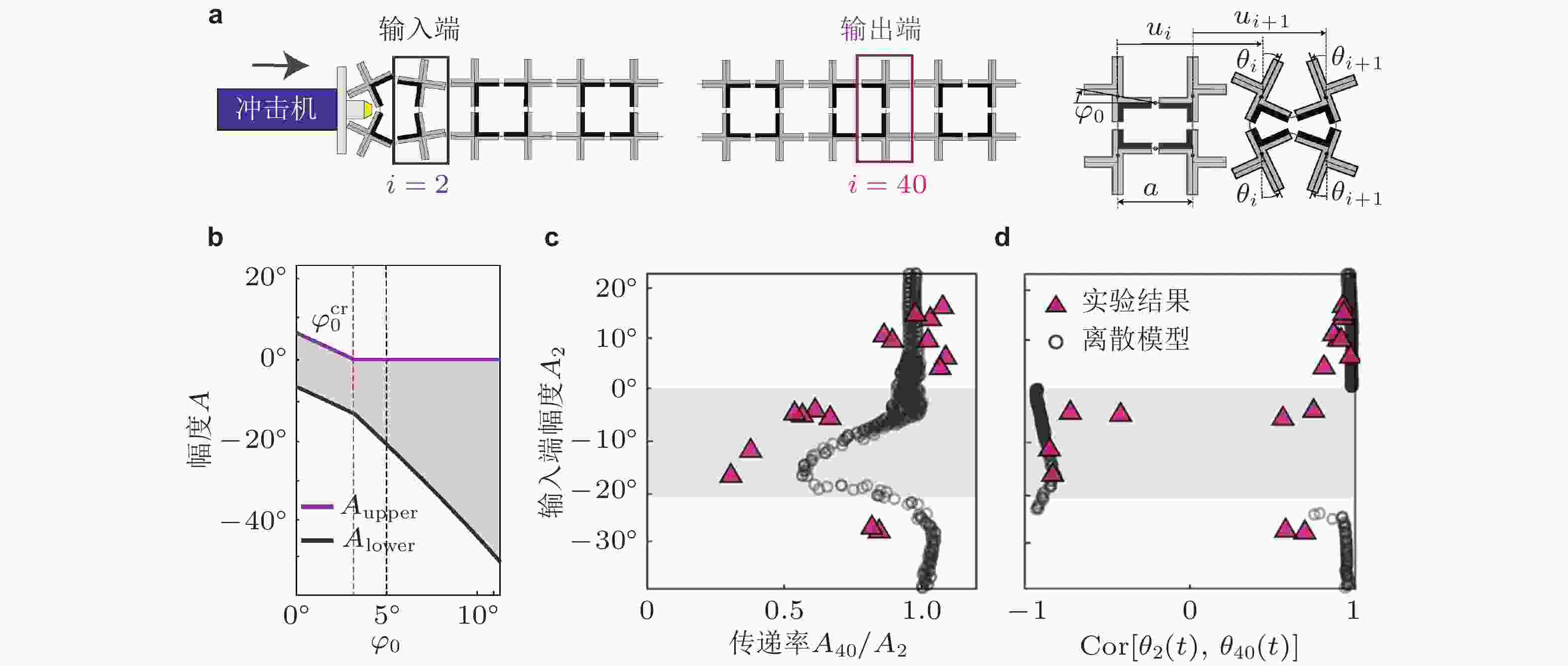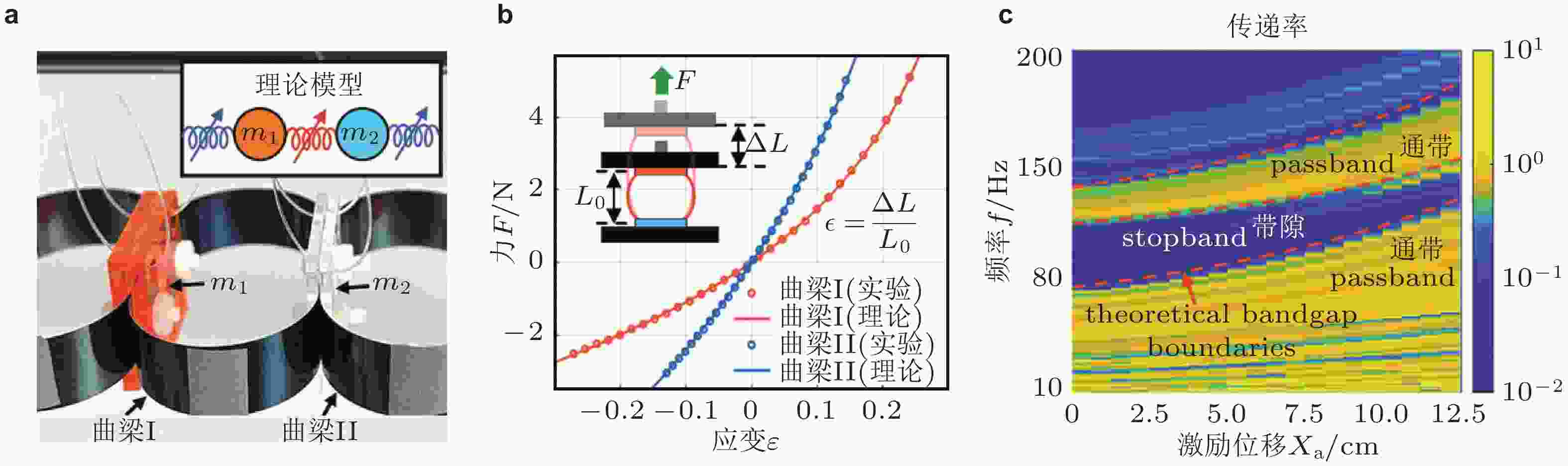 $ {\varphi _0} $ 的变化规律; (c) 幅度传递率$ {{{A_{40}}} /{{A_2}}} $ ; (d)$ {\theta _{40}} $ 和$ {\theta _2} $ 相关性关系; (c)和(d)为$ {\varphi _0} = 5^\circ $ 时的仿真和实验结果. 来自文献(Deng et al. 2018)图 19 非线性周期结构带隙频移特性. (a) 非线性双原子链模型与实物结构; (b) 曲梁结构载荷−变形曲线; (c) 不同激励强度下透射谱实验结果, 橙色虚线表示理论预测的带隙边界, 深蓝区域为带隙范围. 来自文献(Zhang et al. 2023)