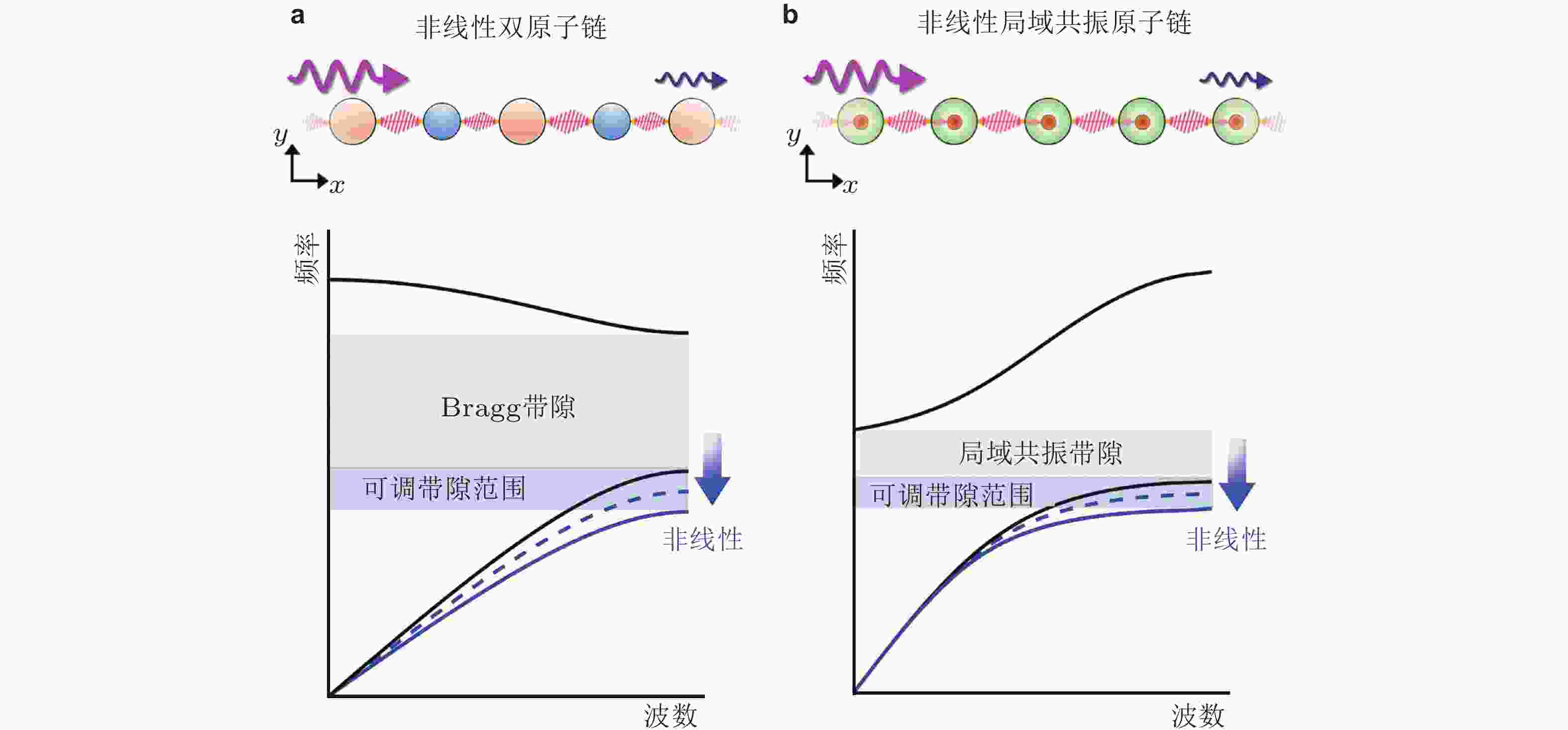 图 17 一维非线性原子链能带曲线与带隙特征. (a) Bragg带隙, (b) 局域共振带隙. 图中黑色实线为线性系统的结果, 蓝色曲线为考虑非线性效应的结果. 来自文献(Bae & Oh 2022)