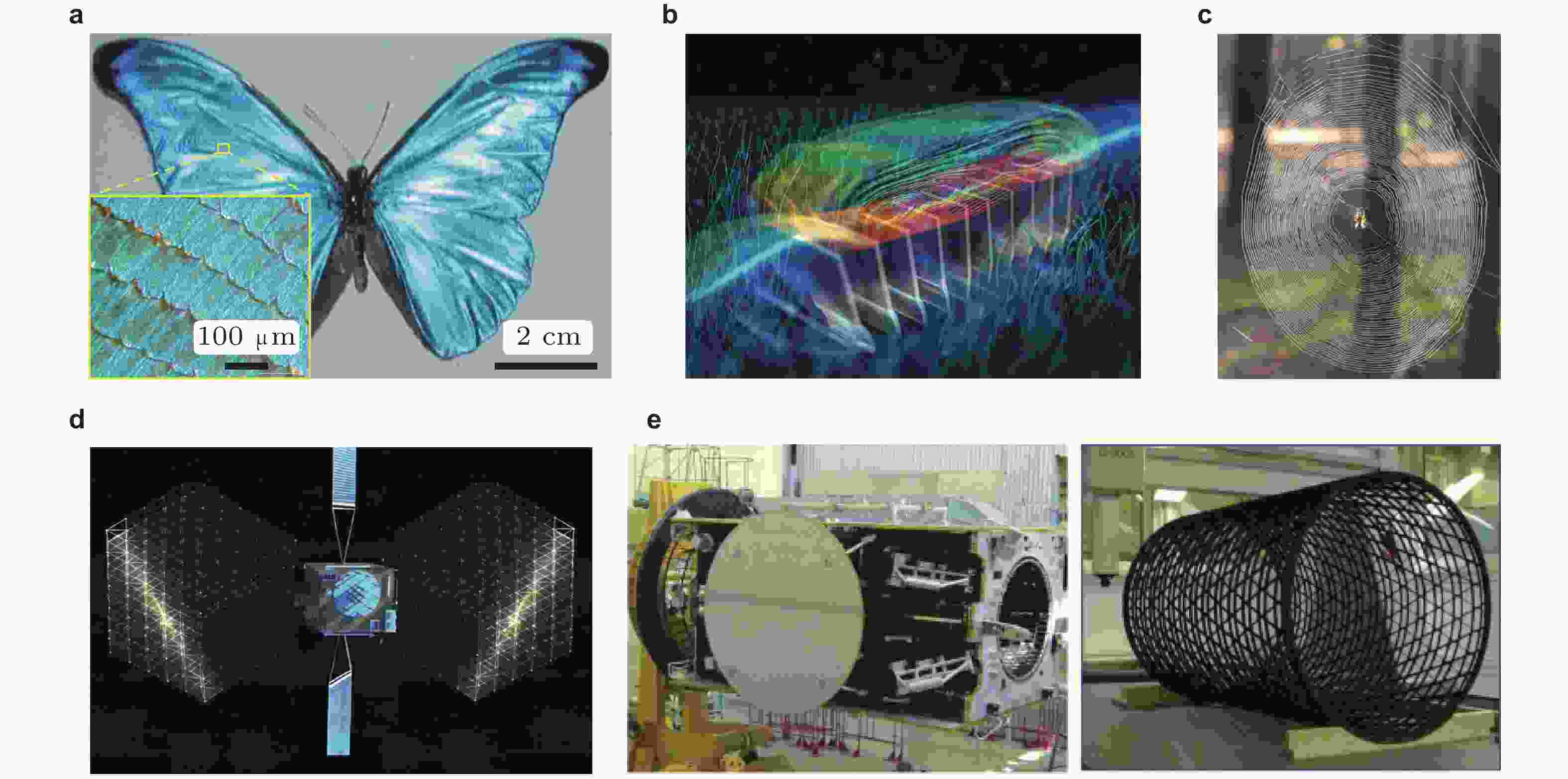图 1 自然界和人类工程中存在的典型周期结构. (a) 蓝闪蝶翅鳞结构(Plattner 2004), (b) 微纤毛驱动流体运动示意图(Wang et al. 2024b), (c) 蜘蛛网, (d) 由周期桁架结构构成的星载天线(Zheng et al. 2022), (e) 运载火箭中由周期格栅构成的复合材料壳体结构(Vasiliev et al. 2012)