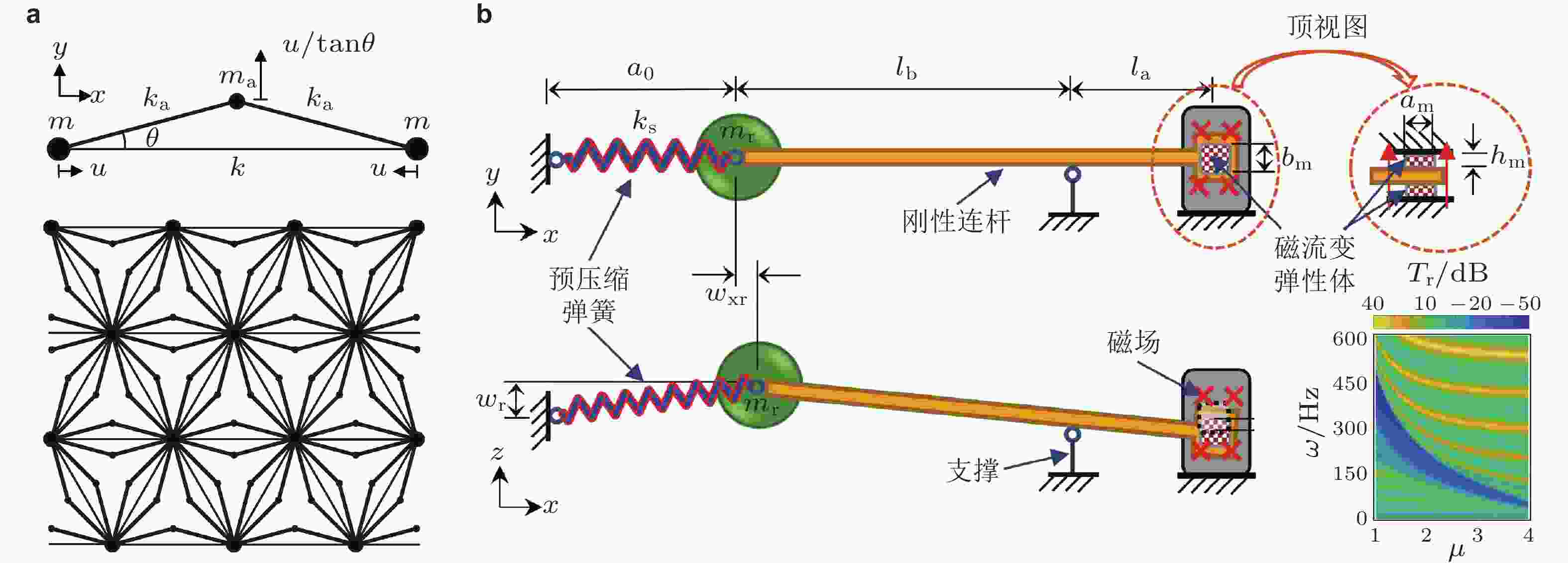 $ {f_0} $ 作用下, 颗粒晶体的透射功率谱密度示意图, 右图施加了频率为$ {f_{\mathrm{c}}} $ 的高幅控制信号; (b) 施加控制信号$ {f_{\mathrm{c}}} $ 后, 实验测量的透射功率谱密度; (c) 含非线性振子的一维原子链模型; (d) 混沌对通带和带隙透射率影响示意图; (e) 单频激励下($ {\Omega _{\text{e}}} = 0.678 $ ), 非线性原子链功率谱密度随激励波幅变化图. 来自文献(Li et al. 2014, Fang et al. 2017b)图 22 惯性放大机构. (a) 弹簧−质量位移放大机构及其组成的二维周期结构(Yilmaz et al. 2007); (b) 由磁流变弹性体构成的主动可调惯性放大机构, 右下角插图为传递率, 随着杠杆比