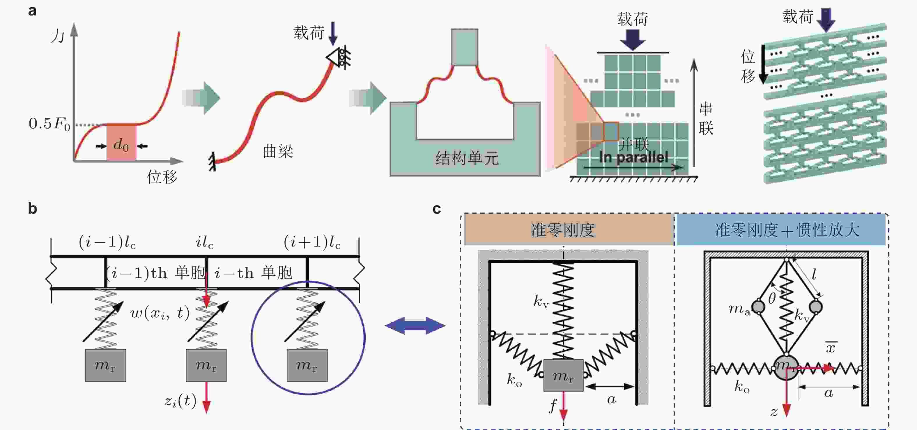 $ \mu = {{{l_{\mathrm{b}}}} / {{l_{\mathrm{a}}}}} $ 增加带隙位置向低频拓展(Xue et al. 2024)图 23 准零刚度周期结构. (a) 曲梁单元及其构成的准零刚度周期结构(Zhang et al. 2021b), (b) 附加准零刚度谐振子的周期梁(Zhou et al. 2019), (c) 基于弹簧正、负刚度抵消效应设计的准零刚度谐振子(Zhou et al. 2019, 2017)