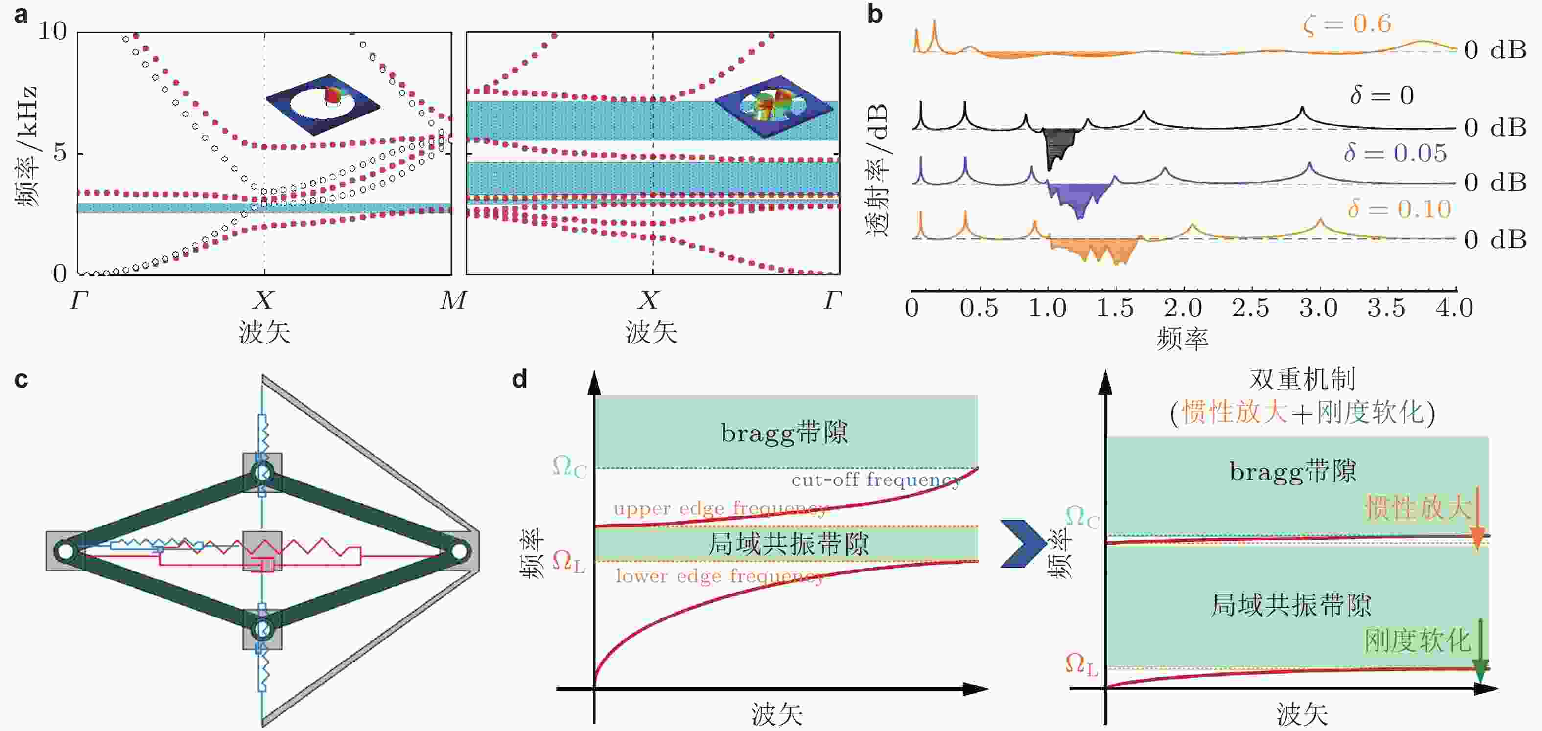 $ \zeta $ 和梯度参数$ \delta $ 的变化图, 参数$ \left( {\zeta ,\delta } \right) $ 从上到下分别为(0.6, 0.1)、(0, 0)、(0, 0.05)和(0, 0.1)(Hu et al. 2021); (c) 融合负刚度和惯性放大效应的单胞结构(Zhou et al. 2024b); (d) 带隙低频宽带拓展示意图(Zhou et al. 2024b)图 25 基于非线性效应的带隙拓宽方法. (a) 非线性弹簧−质量三原子模型; (b) 三原子系统等效质量; (c) 包含20个单胞的非线性原子链频响曲线, 黑色代表线性原子链, 彩色对应不同的非线性系数,