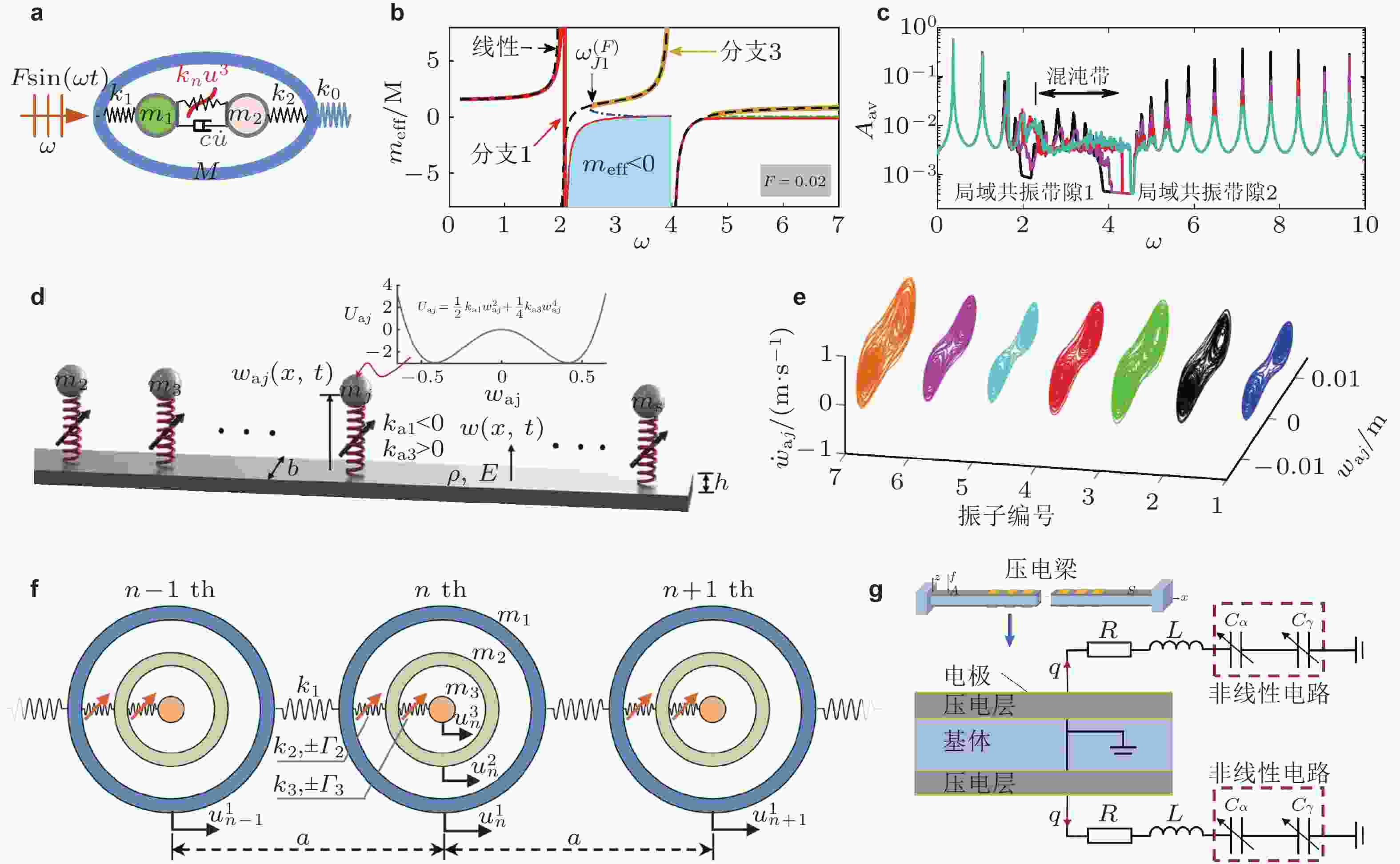 $ {{{k_n}} / {{k_1}}} = 100 $ (洋红色)、$ {{{k_n}} / {{k_1}}} = 500 $ (红色)、$ {{{k_n}} / {{k_1}}} = 1000 $ (青色); (d) 附加双稳态振子的周期梁结构; (e) 双稳态振子相图, 周期梁的基底加速度为$ 0.3g $ , 激励频率为12.5 Hz; (f) 多重局域共振非线性原子链模型; (g) 压电梁与非线性分流电路. 来自文献(Fang et al. 2018, Xia et al. 2020, Zhao et al. 2023c, Chen et al. 2024a)图 26 非线性周期结构能量局域束缚效应. (a) 经典呼吸子波形与频散曲线; (b) 波数带隙呼吸子波形与频散曲线; (c) 颗粒晶体缺陷束缚态频率