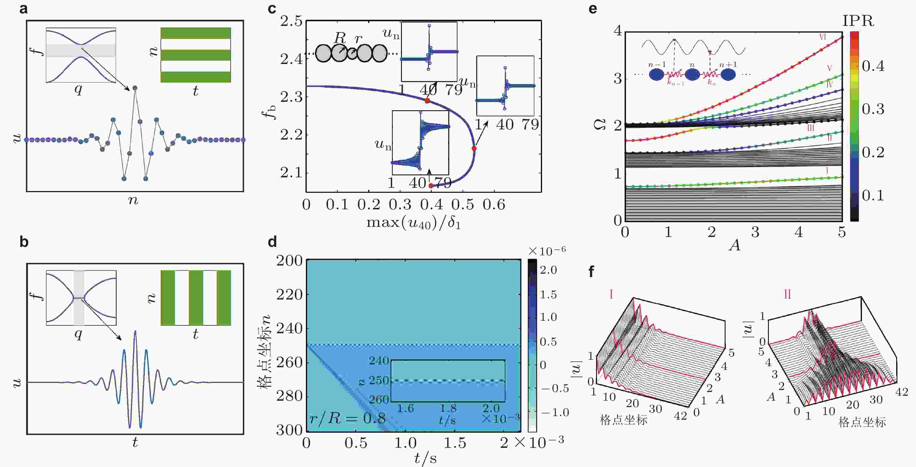 $ {f_b} $ 随激励幅度$ {{\max \left( {{u_{40}}} \right)} / {{\delta _1}}} $ 变化曲线, 插图为颗粒晶体模型和束缚态波形; (d) 大振幅激励下颗粒晶体中弹性波传播和束缚态时空演化过程, 该算例中缺陷束缚态频率为22.47 kHz; (e) 非线性Aubry–André原子链特征频率$ \Omega $ 随波幅$ A $ 变化过程, IPR表征波模式的局域状态, 数值越大表示局域束缚程度越高, 插图为非线性Aubry–André模型示意图; (f) 特征模式I和II空间束缚状态随波幅$ A $ 变化过程. 来自文献(Chong et al. 2024, Theocharis et al. 2009, Rosa et al. 2023)图 27 非线性效应调控拓扑相变. (a) 上图: 基于SSH模型构造的含软化和硬化非线性的原子链模型, 下图: 入射波振幅调控拓扑相变示意图, 大振幅激励可以产生频率为