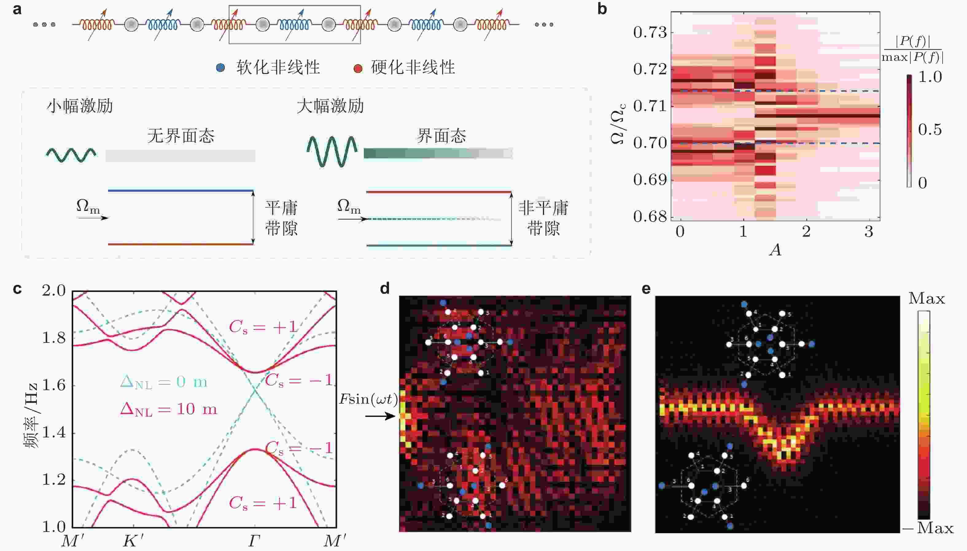 $ {\Omega _{\mathrm{m}}} $ 的拓扑束缚态; (b) 归一化模态幅度随激励幅度$ A $ 变化过程, 颜色越深表示能量局域束缚程度越高; (c) 非线性效应破缺四重简并点(青色虚线在$ \Gamma $ 点构成双Dirac锥结构), 形成拓扑非平庸带隙; (d) F = 1 N激励力作用下六方点阵的位移场分布, 呈现出非局域体波传播现象; (e) F = 100 N 激励力作用下六方点阵的位移场分布, 呈现出界面传播现象. 来自文献(Chaunsali & Theocharis 2019, Darabi & Leamy 2019)图 28 强非线性效应对拓扑束缚态的影响. (a) 基于SSH模型构造的非线性原子链; (b) 带隙内束缚态特征频率