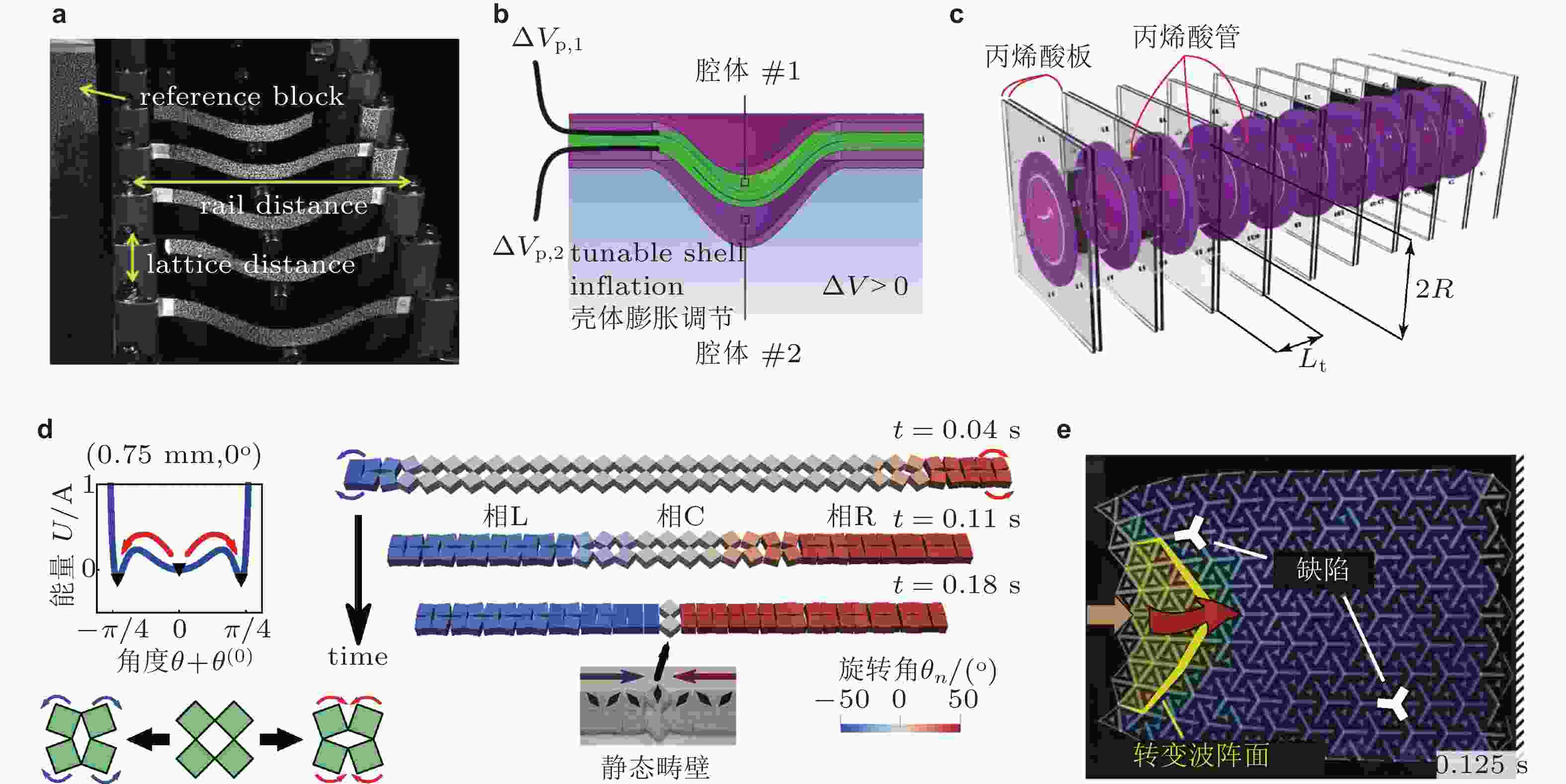 $ \omega $ 随激励能量的变化趋势, 图中阴影区域对应线性原子链的体能带; (c) 不同激励能量下界面态局域状态变化,$ {a_1} $ ~$ {j_1} $ 对应图(b)中标识点; (d) 在线性SSH模型中引入手性对称缺陷后, 束缚态频率随缺陷强度$ \left| \delta \right| $ 的变化; (e) 手性对称缺陷对非线性界面态鲁棒性的影响, 模式浓度表示波模式的局域束缚程度, 数值越大, 能量局域程度越高. 来自文献(Tempelman et al. 2021)图 29 多稳态周期结构与转变波. (a) 由预压缩复合材料曲梁构成的双稳态周期结构, 利用永磁体在结构单元间产生非线性斥力(Nadkarni et al. 2016); (b) 充气式主动可调双稳态壳体结构(Vasios et al. 2021); (c) 由双稳态壳体构成的一维周期结构(Vasios et al. 2021); (d) 三稳态周期结构与转变波碰撞现象(Yasuda et al. 2020); (e) 利用缺陷和边界引导拉胀周期结构中转变波的传播(Jin et al. 2020)