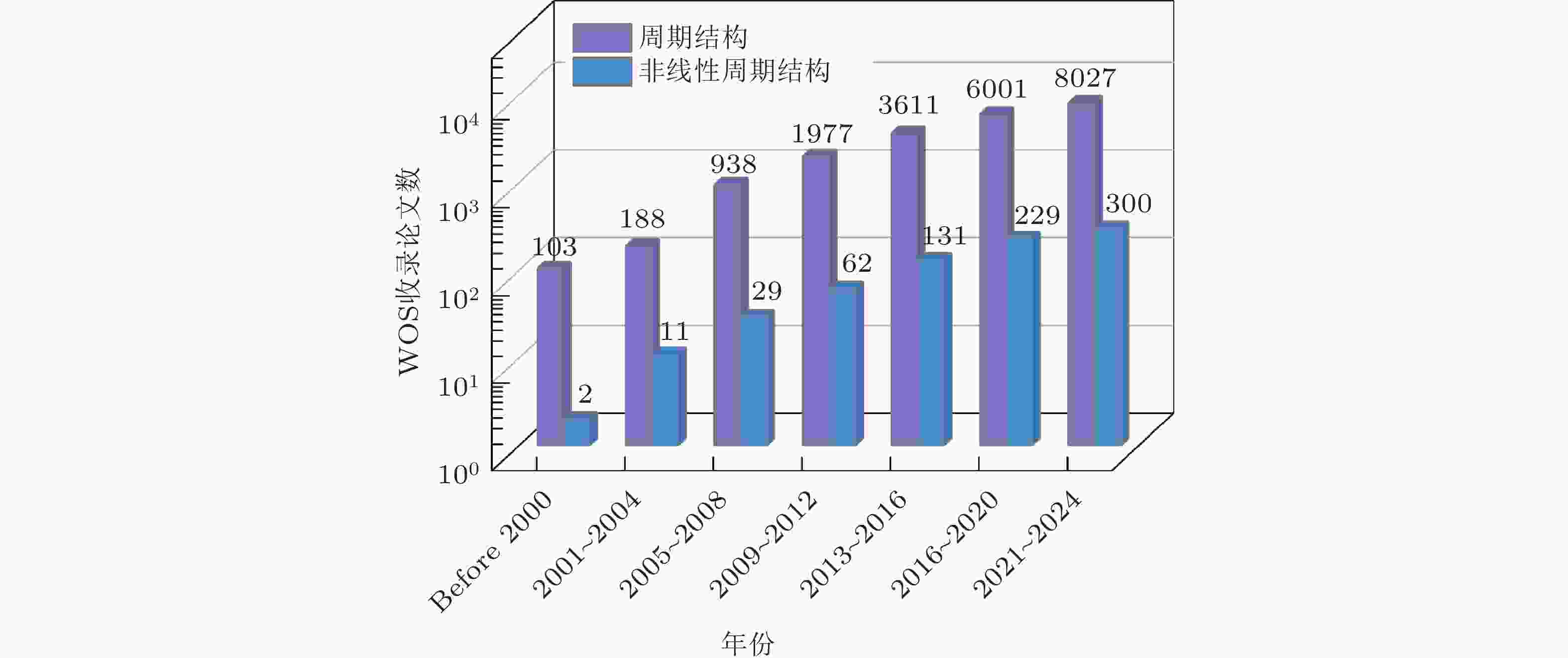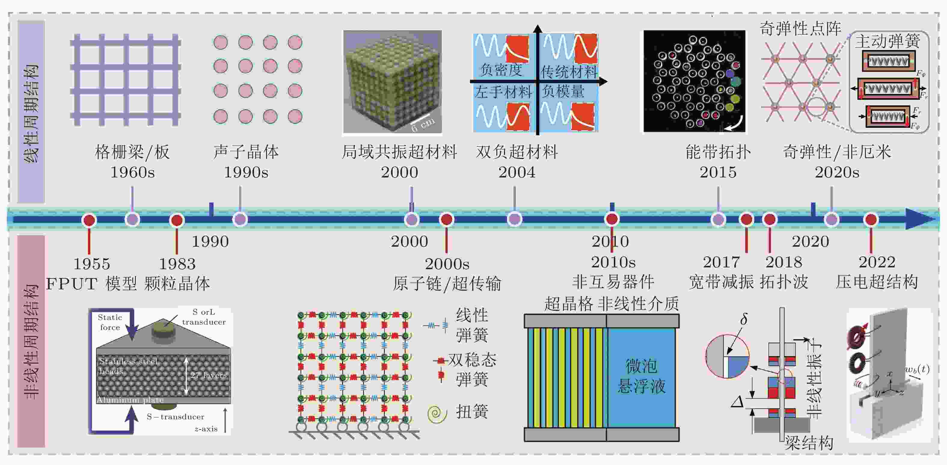 图 2 线性周期结构和非线性周期结构发展历程简图. 来自文献(Liu et al. 2000, 陈毅 等 2016, Nash et al. 2015, Gao et al. 2022b, Merkel et al. 2011, Meaud 2020, Liang et al. 2010, Fang et al. 2017a, Alfahmi et al. 2022)