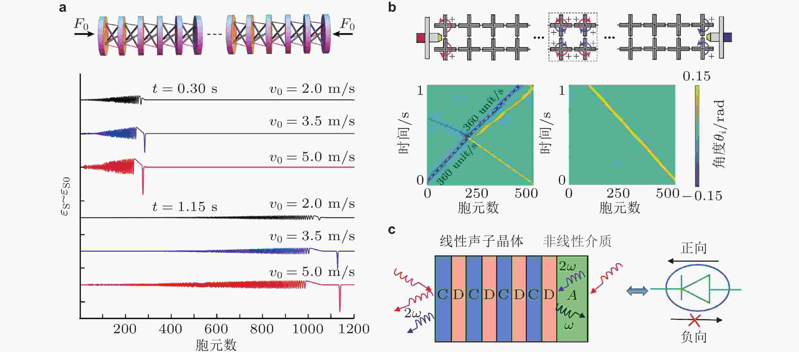 图 30 弹性孤波与非互易波. (a) 上图: 张拉整体结构, 下图: 不同冲击速度