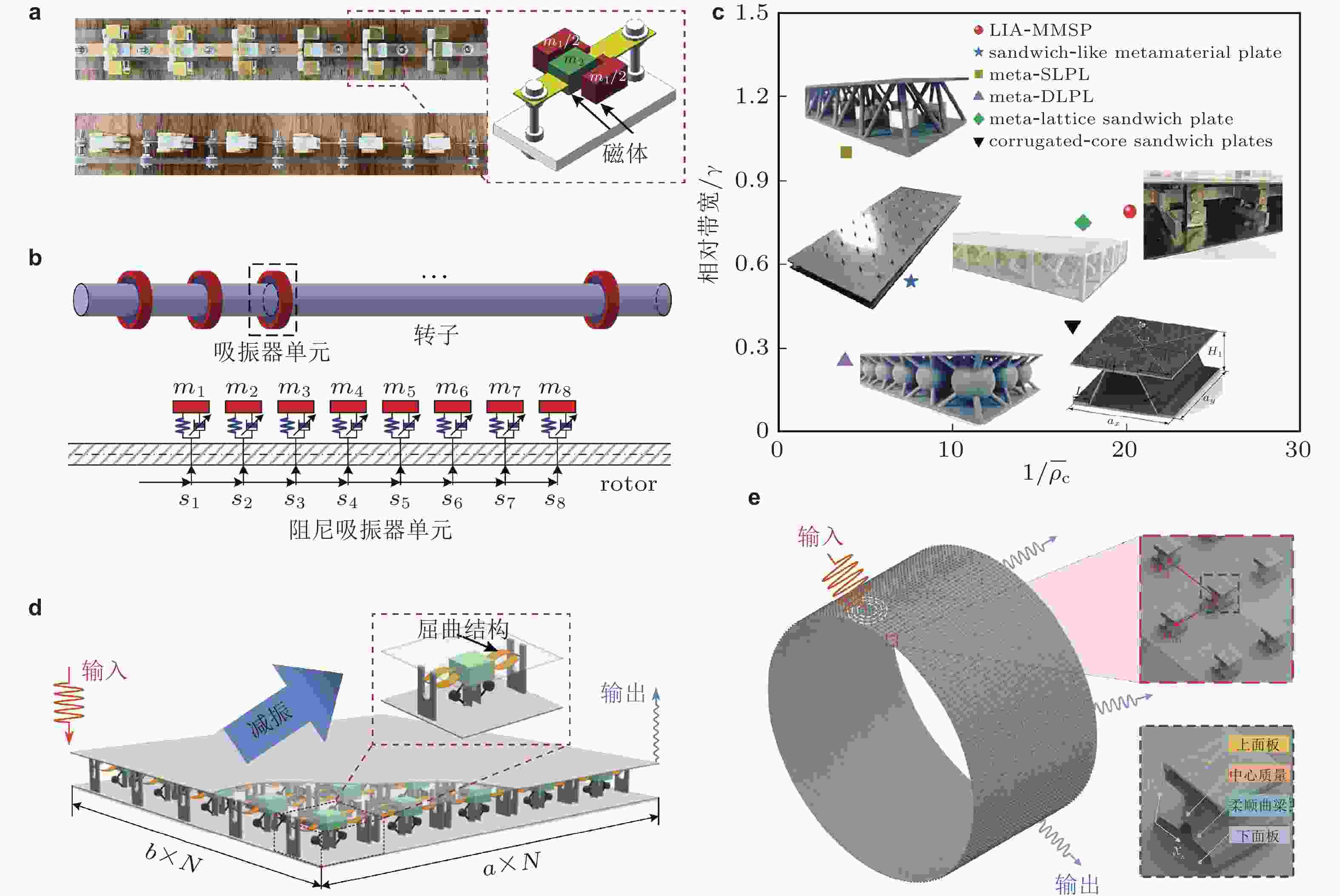 $ {v_0} $ 下压缩脉冲转变为稀疏型孤波的演化过程(Fraternali et al. 2014); (b) 上图: 由柔性铰链构成的一维周期结构, 下图: 矢量孤波传播与碰撞过程(Deng et al. 2019b); (c) 由线性周期结构和非线性介质构成的非互易系统, 实现弹性波/声波二极管功能(Li et al. 2019)图 31 梁/板/壳等代表性结构形式与周期结构设计. (a) 受磁力控制的非线性梁结构(Xue et al. 2023), (b) 周期性排布动力吸振器的转子结构(Xu et al. 2023), (c) 几种轻质夹芯结构的相对密度−带隙宽度对比图(Gao et al. 2024), (d) 含惯性放大共振结构的三明治夹芯板(Yang et al. 2024), (e) 附加准零刚度单元的圆柱壳周期结构(Cai et al. 2024)