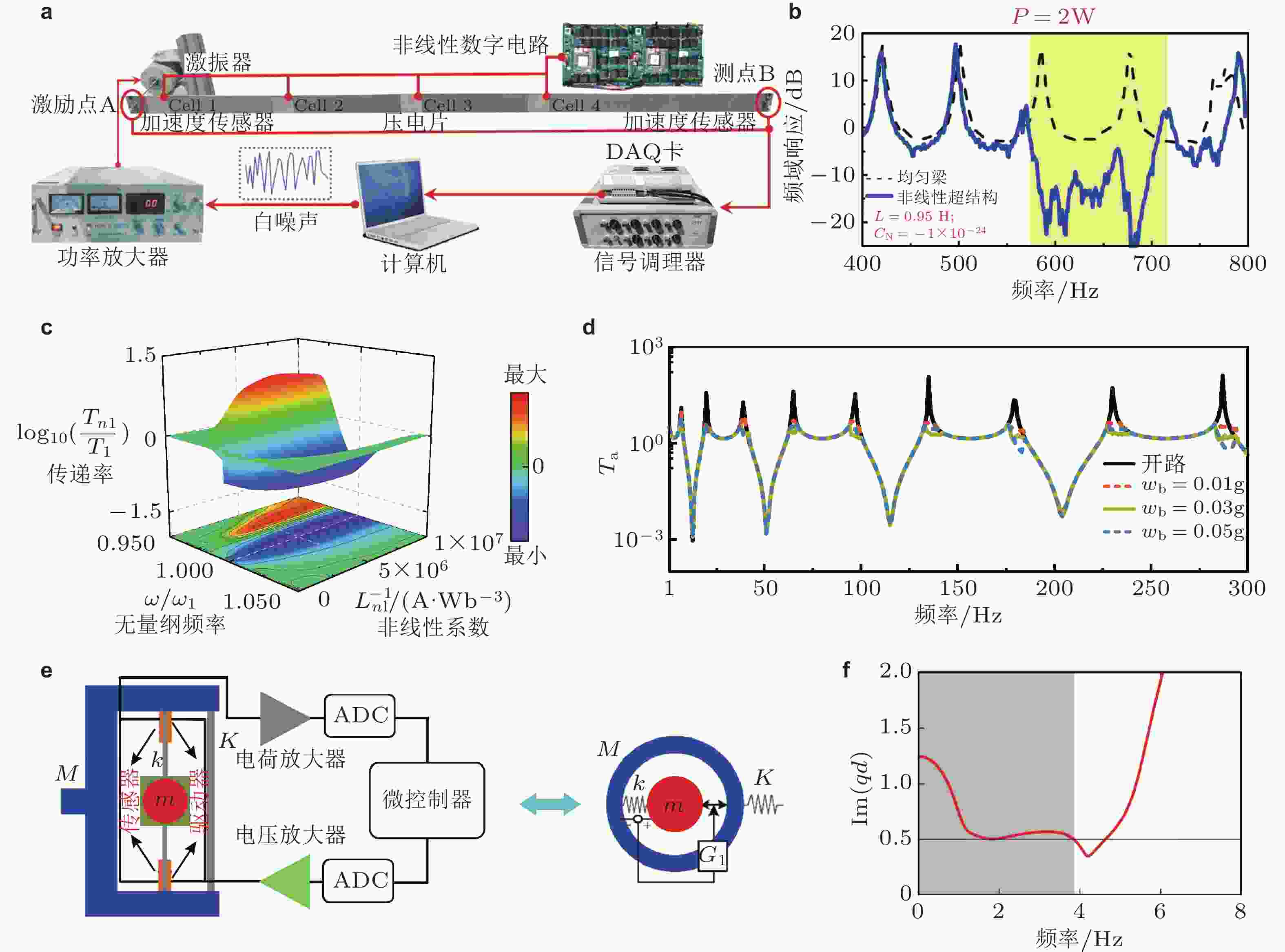 图 32 基于非线性分流电路的压电周期结构与低频振动控制. (a) 压电周期结构实验装置; (b) 压电梁在微幅激励下的振动频响, 黄色阴影区域表示非线性带隙; (c) 压电梁非线性动力学频响特性; (d) 压电梁传递率频响曲线, 调节纯非线性系数实现宽带可调振动控制; (e) 主动胞元结构, 压电片用于实现时滞反馈控制; (f) 优化时滞参数获得的超宽带隙(灰色阴影区域). 来自文献(Zhang et al. 2021c, Gong et al. 2025, Gao & Wang 2023)