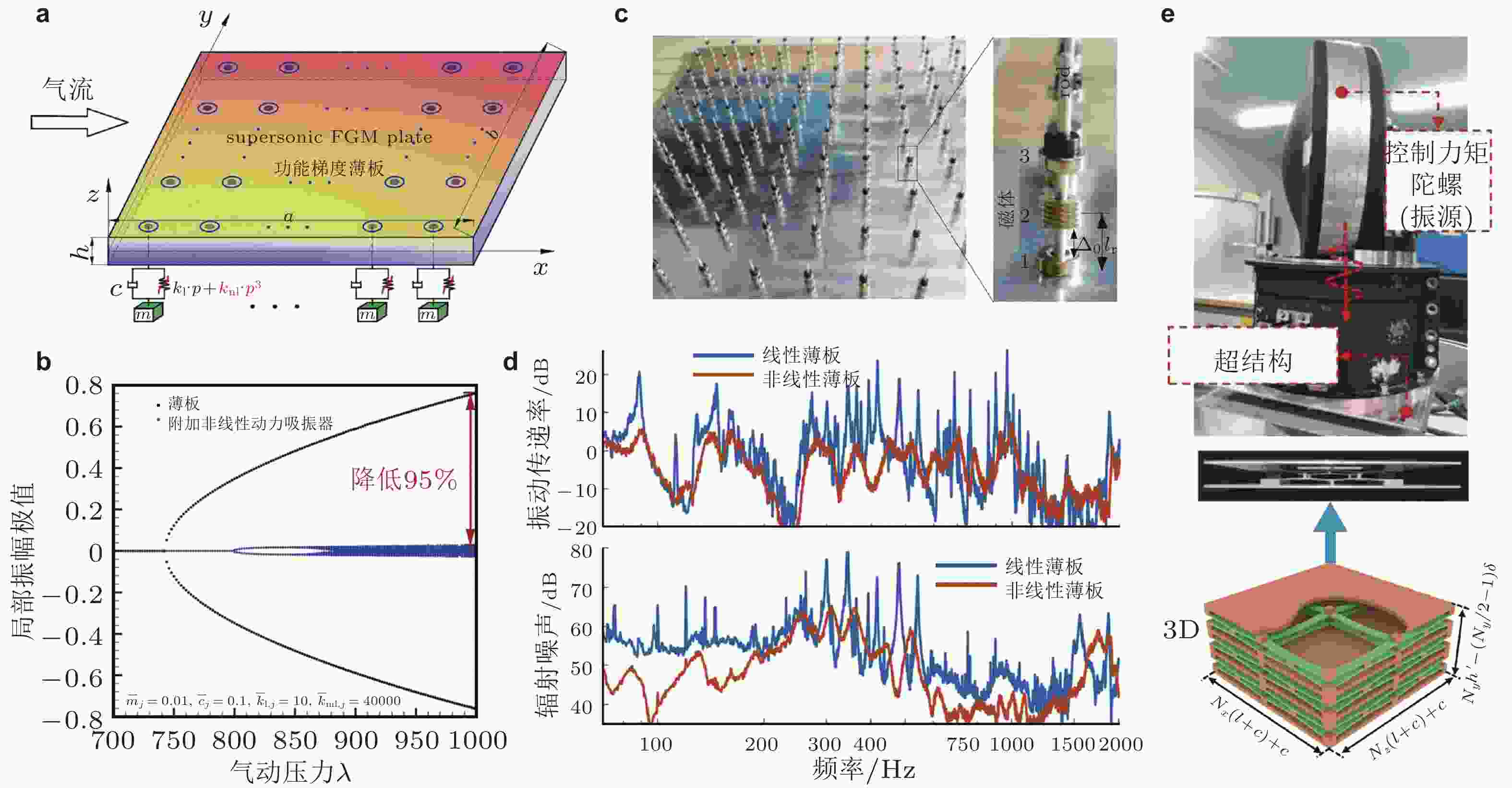图 33 非线性周期结构在航空航天领域振动控制中的应用. (a) 超音速来流下功能梯度壁板颤振控制示意图; (b)壁板结构局部位移极值分岔图, 壁板上周期排布非线性动力吸振器; (c) 附加非线性振子的薄板周期结构, 局部放大图展示了由永磁体构成的强非线性共振结构; (d) 线性和非线性振子作用下, 薄板结构振动和辐射噪声频谱; (e) 准零刚度周期结构及其在航天器控制力矩陀螺隔振系统中的应用. 来自文献(Tian et al. 2022a, Fang et al. 2022, Zhao et al. 2023b)