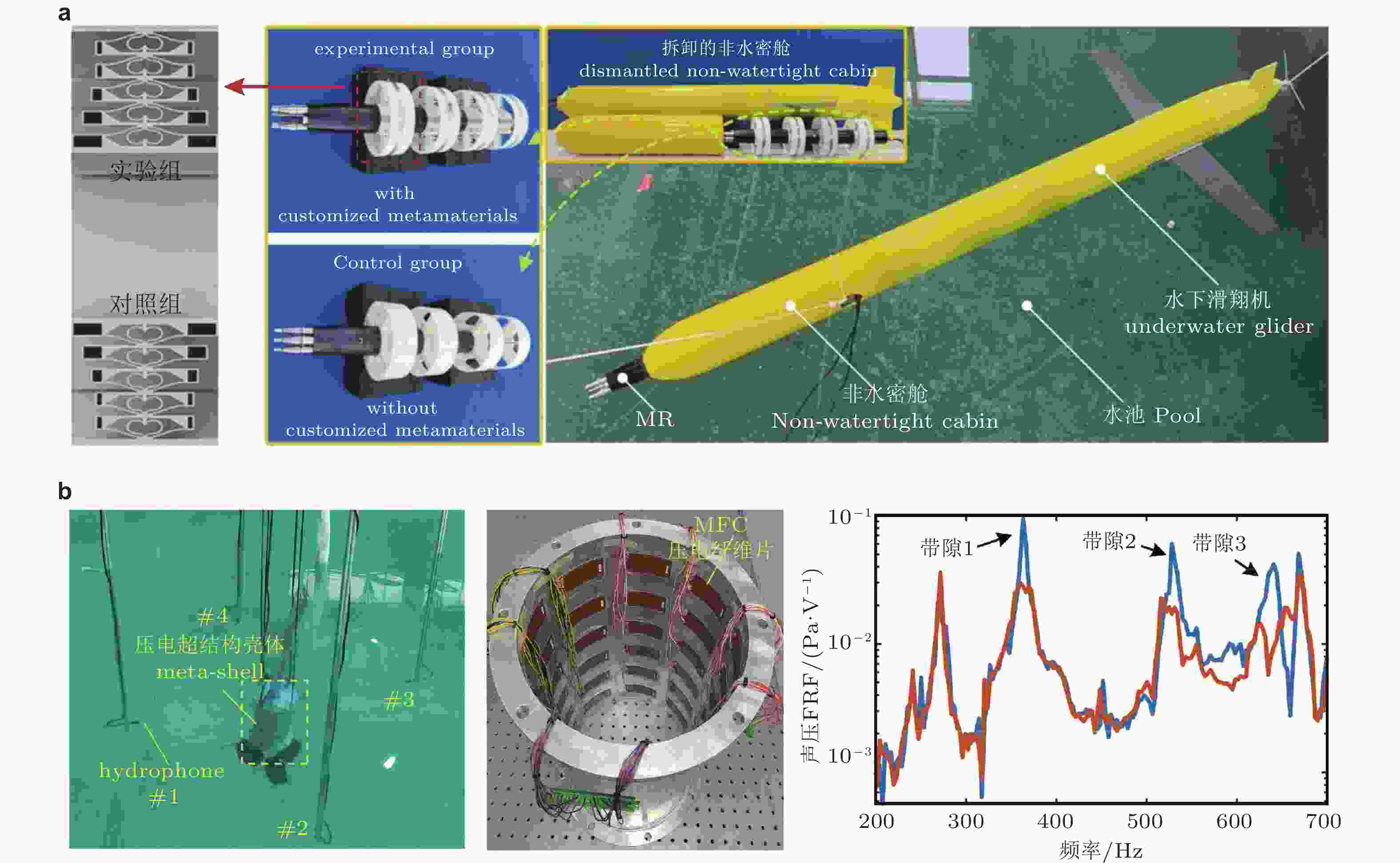 图 34 水下结构声振耦合控制. (a) 左图: 准零刚度周期结构, 右图: 水下滑翔机超低频隔振应用(Liu et al. 2024); (b) 压电周期结构用于水下壳体多模态声振耦合控制(Zheng et al. 2024)