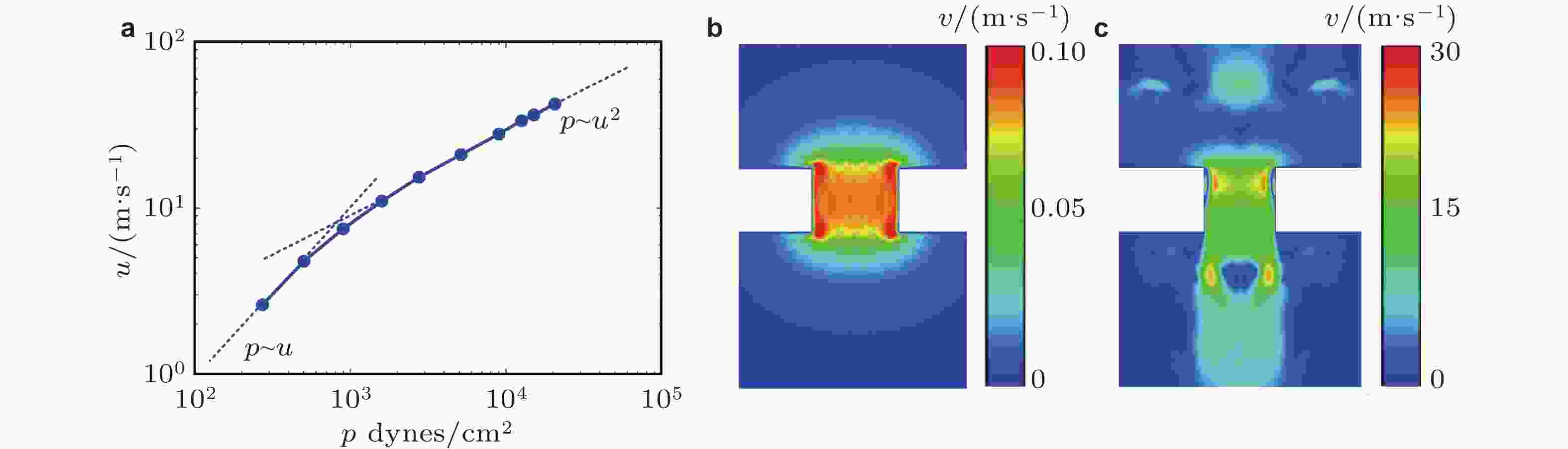 图 35 高声压级下微孔结构非线性声学特性. (a) 孔口粒子振速与激励声压之间呈现非线性关系, (b) 90 dB下Helmholtz共鸣器孔口粒子振速分布, (c) 140 dB下孔口粒子振速分布. 来自文献(Ingard & Ising 1967, Zhu et al. 2022)