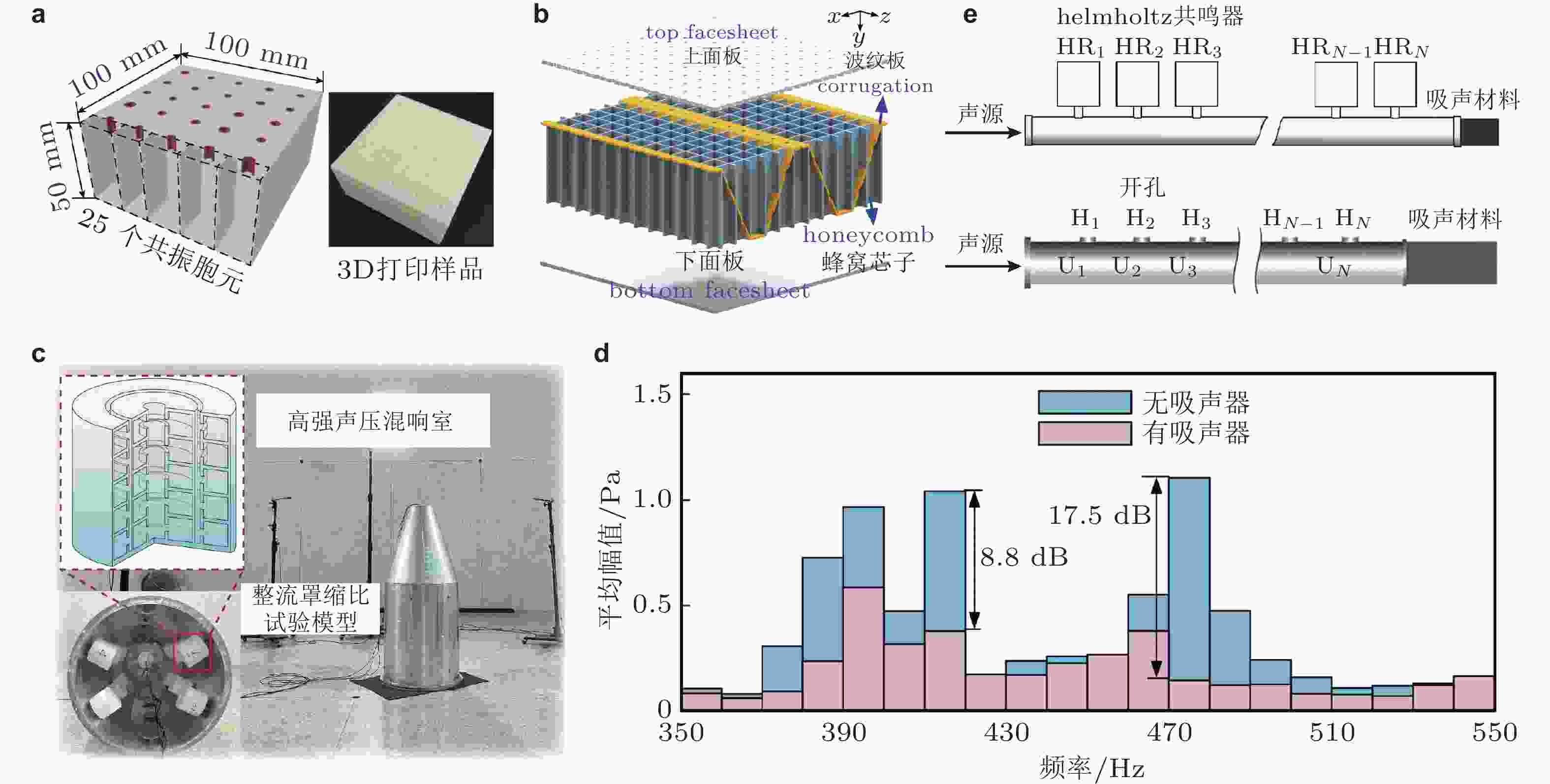 图 36 吸隔声阵列结构. (a) Helmholtz共鸣器平面阵列结构(Huang et al. 2020); (b) 轻质蜂窝夹芯板吸声结构(Tang et al. 2020); (c) 周期性多层嵌套吸声结构(插图)与高声强混响室吸声性能测试装置(Zhu et al. 2023a); (d) 整流罩模型布置吸声器前后, 内声腔噪声频谱(Zhu et al. 2023a); (e) 含Helmholtz共鸣器或微孔阵列的一维声管道(Fan et al. 2013, Lan et al. 2017)