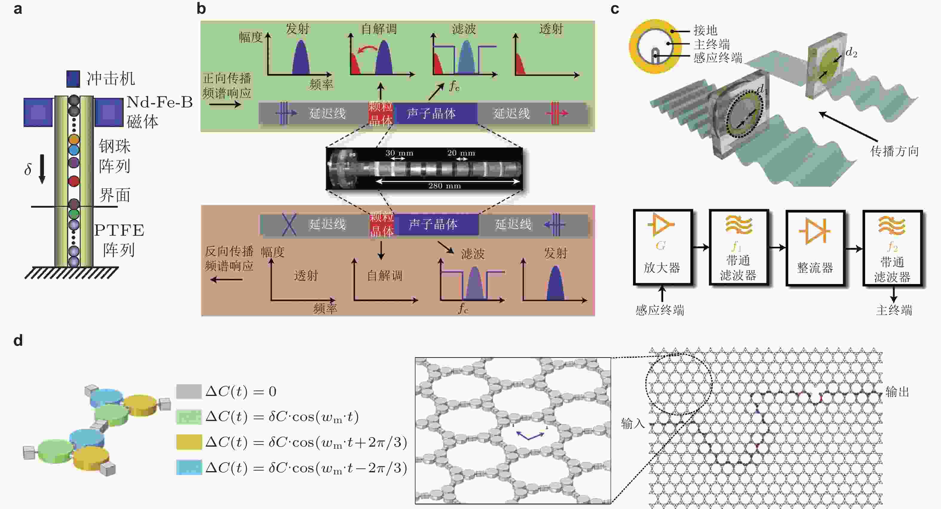 图 37 基于异质界面和有源主动系统构造的非互易整流器件. (a) 钢珠和聚四氟乙烯珠(PTFE)构成的颗粒晶体, 顶端通过磁体施加预紧力(Nesterenko et al. 2005); (b) 弹性波整流器件与工作原理示意图, 整流器件由颗粒晶体和层状周期结构构成(Devaux et al. 2015); (c) 有源声学整流器件(Popa & Cummer 2014); (d) Floquet拓扑绝缘体与单向边界态, 通过对单胞声容进行时变调制引入非互易效应(Fleury et al. 2016)