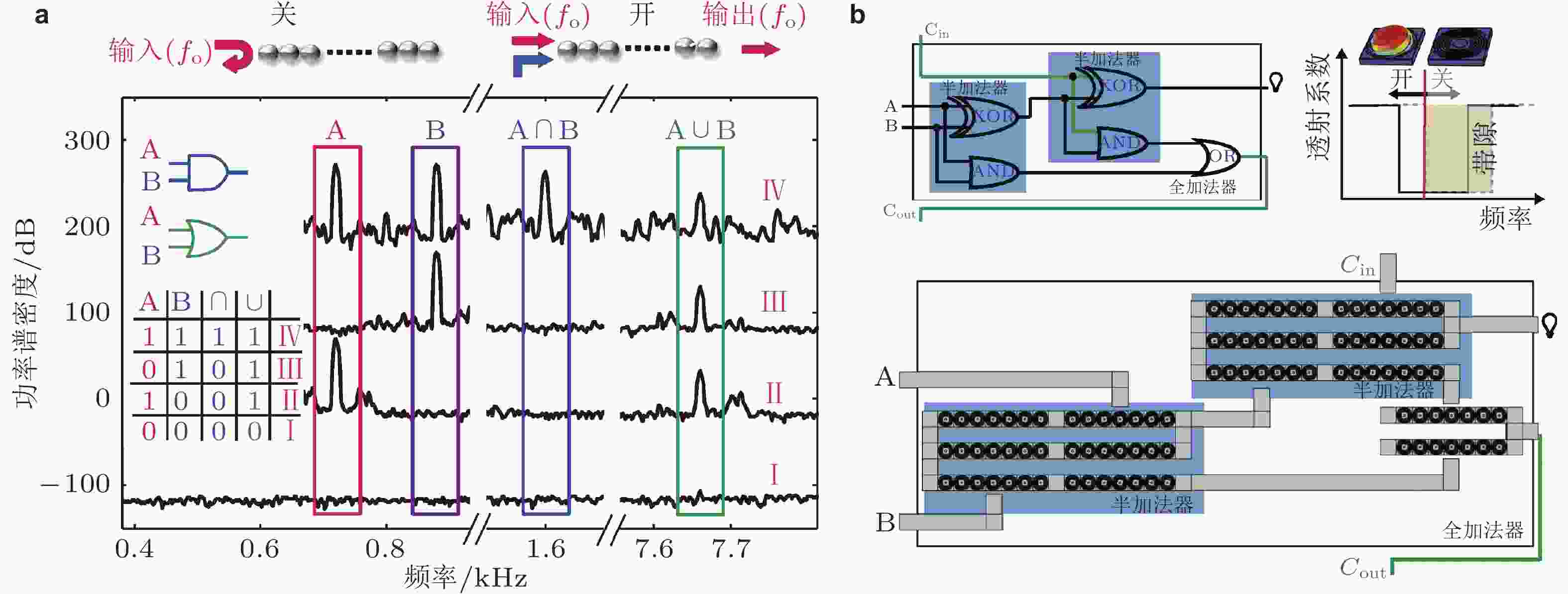 图 38 基于弹性波传播特性设计的逻辑门器件. (a) 颗粒晶体开关功能示意图及OR/AND逻辑运算信号功率谱密度(Li et al. 2014); (b) 全加法器原理图与对应的周期结构实现装置, 右上角插图为弹性波开关原理示意图, 随着单胞构型变化传输信号会在开/关两种状态间切换(Bilal et al. 2017)