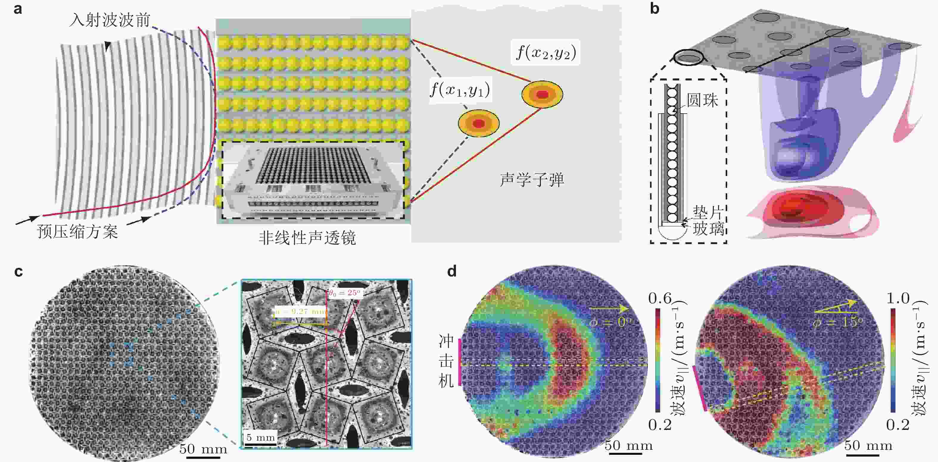 图 39 非线性波束操纵器件. (a) 由颗粒晶体构成的非线性聚焦透镜, 调节静态预紧力空间分布可改变焦点位置(Spadoni & Daraio 2010); (b) 二维非线性声透镜, 彩色表示水中声学子弹恒压面(Donahue et al. 2014); (c) 柔性铰链构成的非线性周期结构(Deng et al. 2019a); (d) 不同冲击角下的孤波脉冲速度场分布(Deng et al. 2019a)