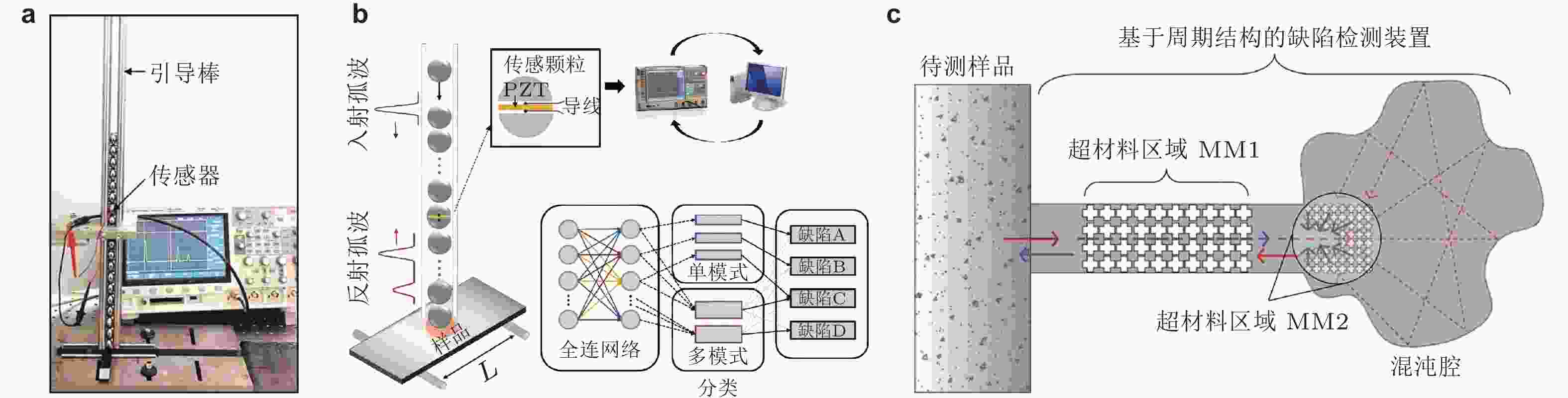 图 40 基于周期结构实现无损检测或健康监测功能. (a) 利用颗粒晶体中孤波反射特性识别复合材料弱粘接区域(Singhal et al. 2017); (b) 颗粒晶体用于复合材料分层损伤实时监测(Yoon et al. 2023); (c) 由周期结构滤波区域(MM1)、周期结构聚焦区域(MM2)和混沌腔构成的缺陷检测装置(Gliozzi et al. 2015)