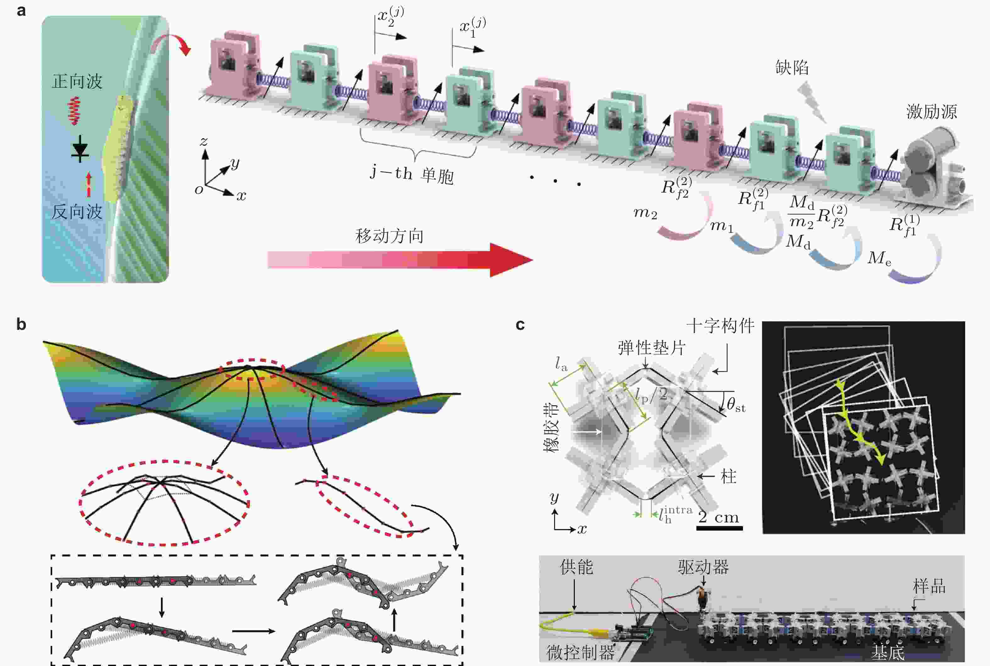 图 41 基于波传播的致动器件. (a) 毛毛虫爬行运动的“二极管”输运特性, 以此可设计能够单向运动的周期结构致动器件(Zhou & Wang 2024); (b) 由刚性杆和双稳态关节组成的机械连杆机构, 利用转变波现象实现空间展开部署(Zareei et al. 2020); (c) 双稳态旋转方块结构单元与其构成的二维周期结构致动器件(Deng et al. 2022a)