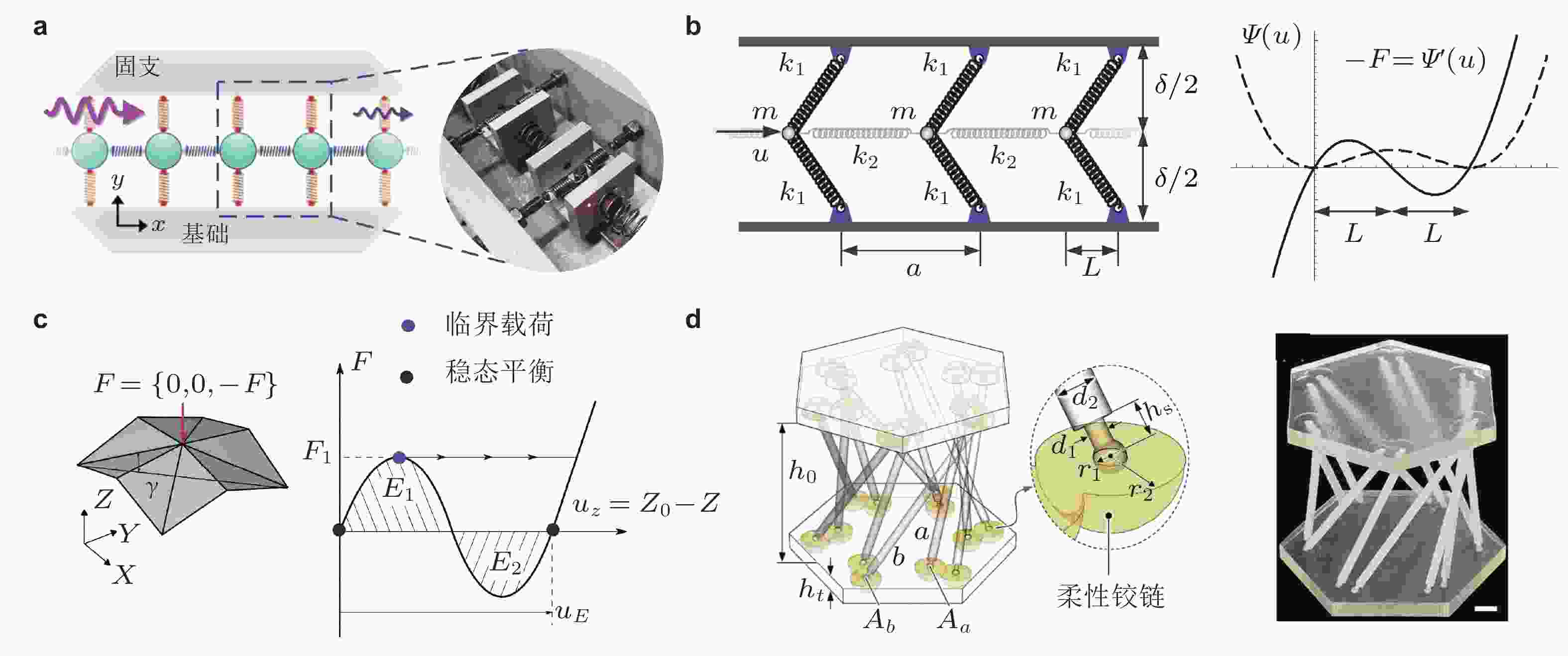 图 5 通过几何构型设计实现非线性回复力. (a) 线性弹簧组合结构, 实现三次非线性回复力(Bae & Oh 2022); (b) 线性弹簧组合结构实现双稳态(Nadkarni et al. 2014); (c) 折纸双稳态结构(Gillman et al. 2018); (d) 连杆−软铰链组合结构(Zhang & Rudykh 2024)