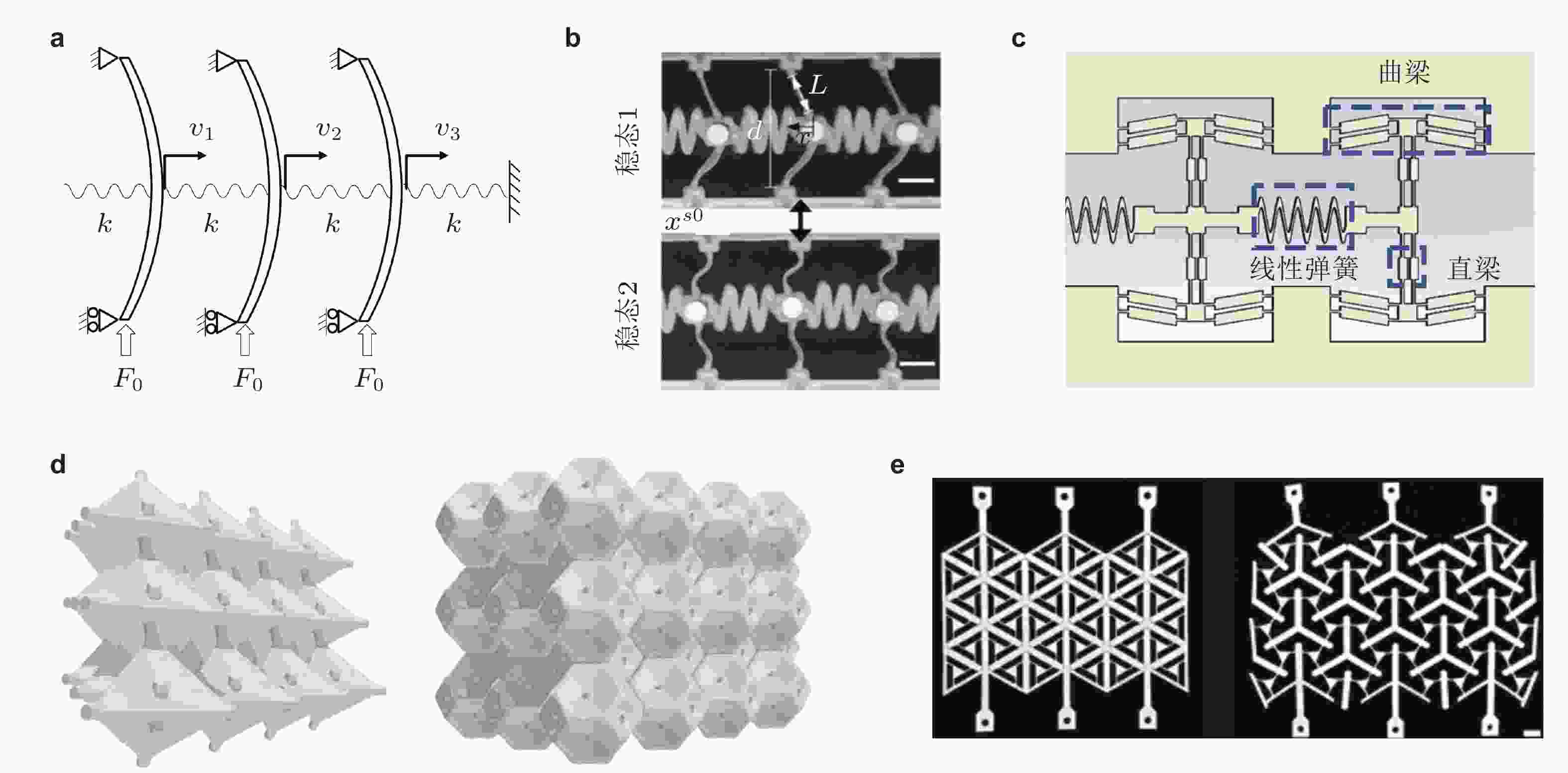 图 6 利用几何大变形和材料非线性实现非线性回复力. (a) 屈曲梁周期结构(Bidhendi 2022), (b) 大变形超弹性梁−弹簧双稳态结构(Raney et al. 2016), (c) 曲梁−直梁−弹簧多稳态结构(Xu & Xiang 2024), (d) 大变形屈曲壳可重构多稳态结构(Khajehtourian & Kochmann 2021), (e) 多稳态网络结构(Jin et al. 2020)