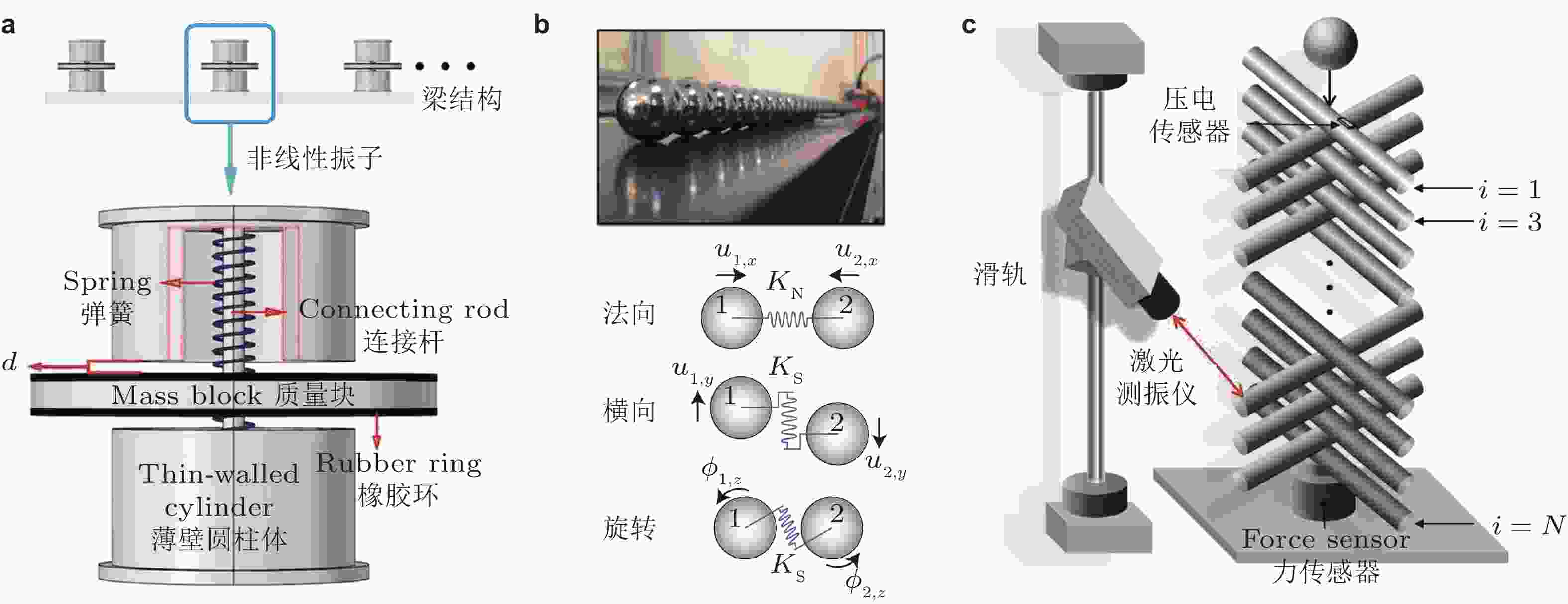 图 7 利用接触或碰撞实现非线性回复力. (a) 带间隙的弹簧−质量振子结构(Yu et al. 2024), (b) 颗粒晶体(Allein et al. 2020), (c) 木桩结构(Kim et al. 2015)