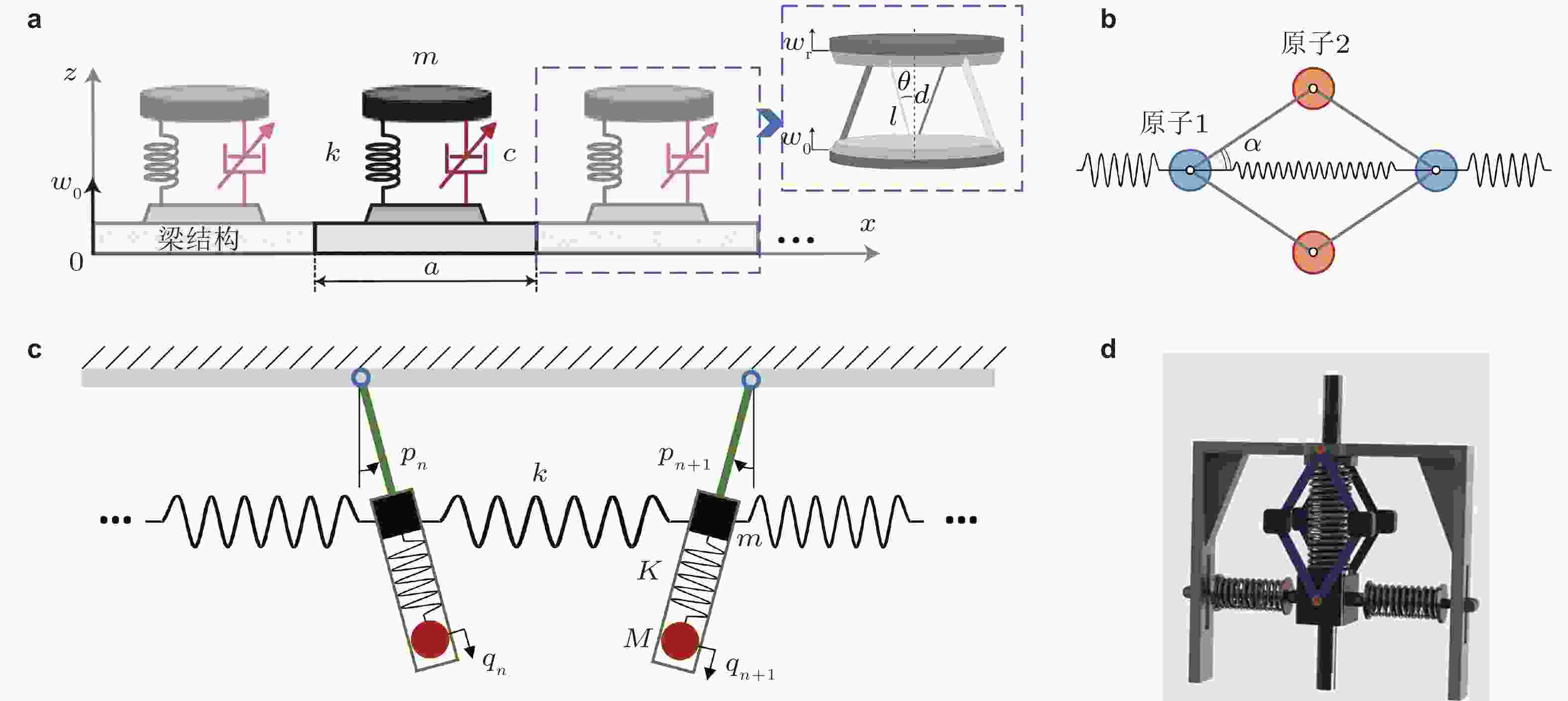 图 9 非线性惯性力和非线性阻尼力. (a) 惯性放大旋转结构, 实现非线性阻尼力(Zhao et al. 2024); (b) 弹簧−连杆惯性放大机构, 同时实现非线性惯性力和非线性阻尼力(Settimi et al. 2021); (c) 弹簧摆结构, 同时实现非线性惯性力和非线性阻尼力(Zhou et al. 2024a); (d)弹簧−连杆组合结构, 同时实现非线性惯性力、非线性阻尼力和非线性回复力(Zhou et al. 2019)