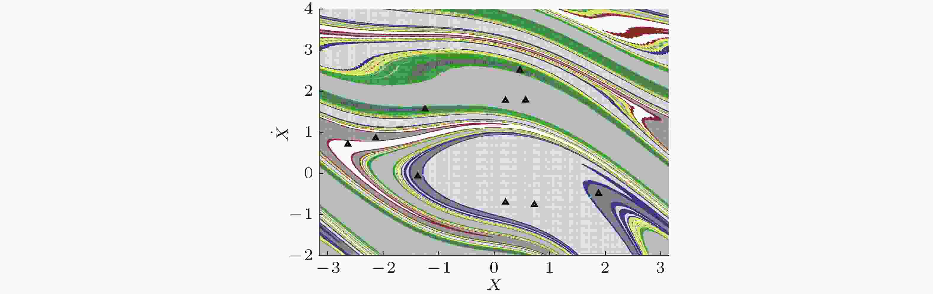 图 10 阻尼摆系统六个共存吸引域间的Wada边界(Liu et al. 2018). 其中黑色“▲”代表共存的多个吸引子, 彩色点为吸引域的影响区域, 不同吸引域间的边界表现出典型分形特征