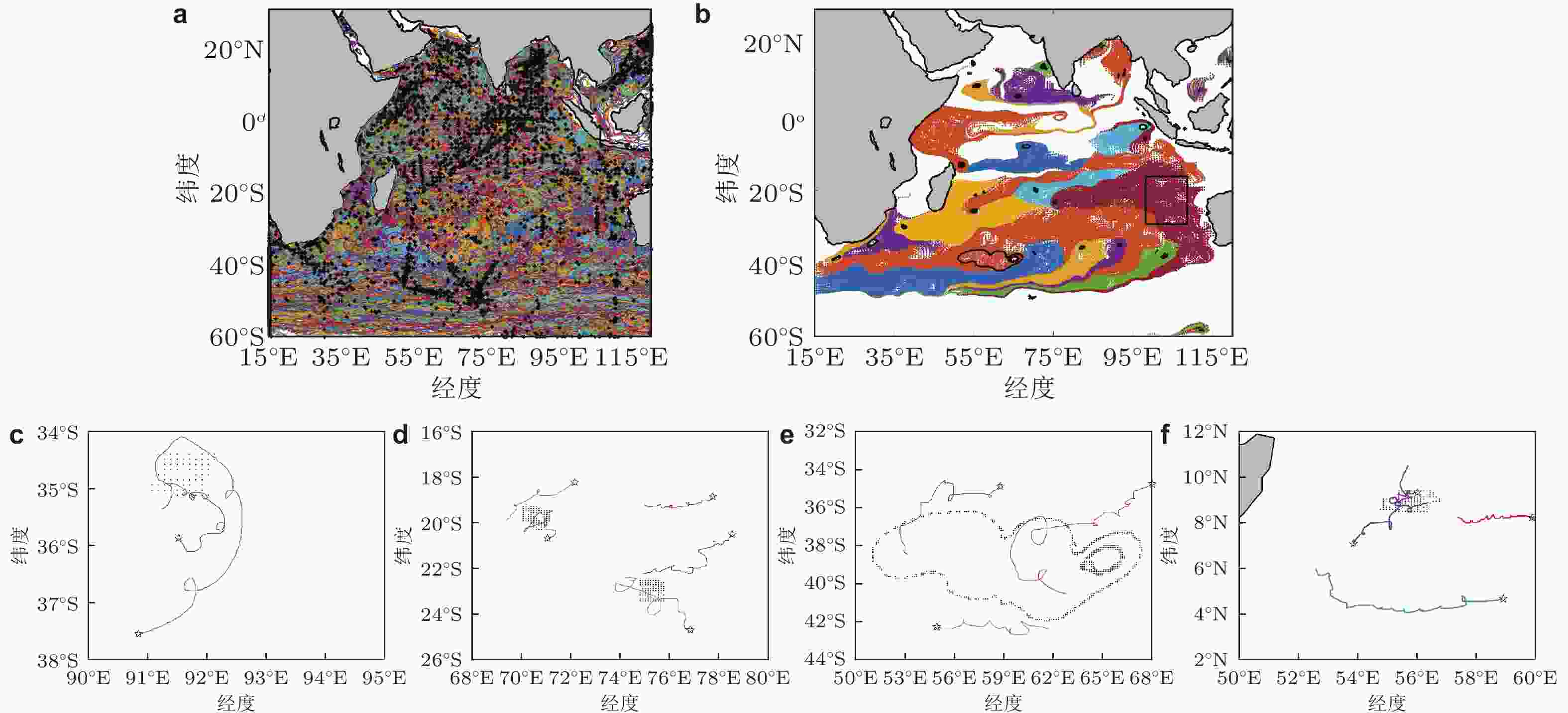 图 11 2014年3月8日—14日印度洋海域洋流短期运动特征及对周围浮漂的吸引性(李自刚 等 2021). (a) 印度洋海域布置的浮漂数据及运动轨迹, (b) 短期涡旋中心(黑色点)和涡旋域 (彩色区域), (c) ~ (f) 不同涡旋中心对周围浮漂运动轨迹 (真实数据) 的吸引性