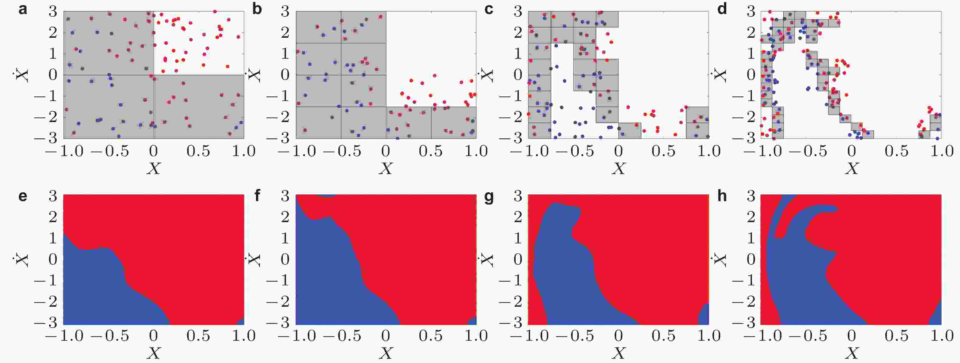 图 12 非线性系统渐进式学习及预测能力的进化过程(Li et al. 2024b). (a) ~ (d) 样本提取区域的精细化 (胞分辨率分别为2 × 2, 4 × 4, 8 × 8, 16 × 16), (e) ~ (h) 数据模型对全局吸引域学习和预测能力的进化过程