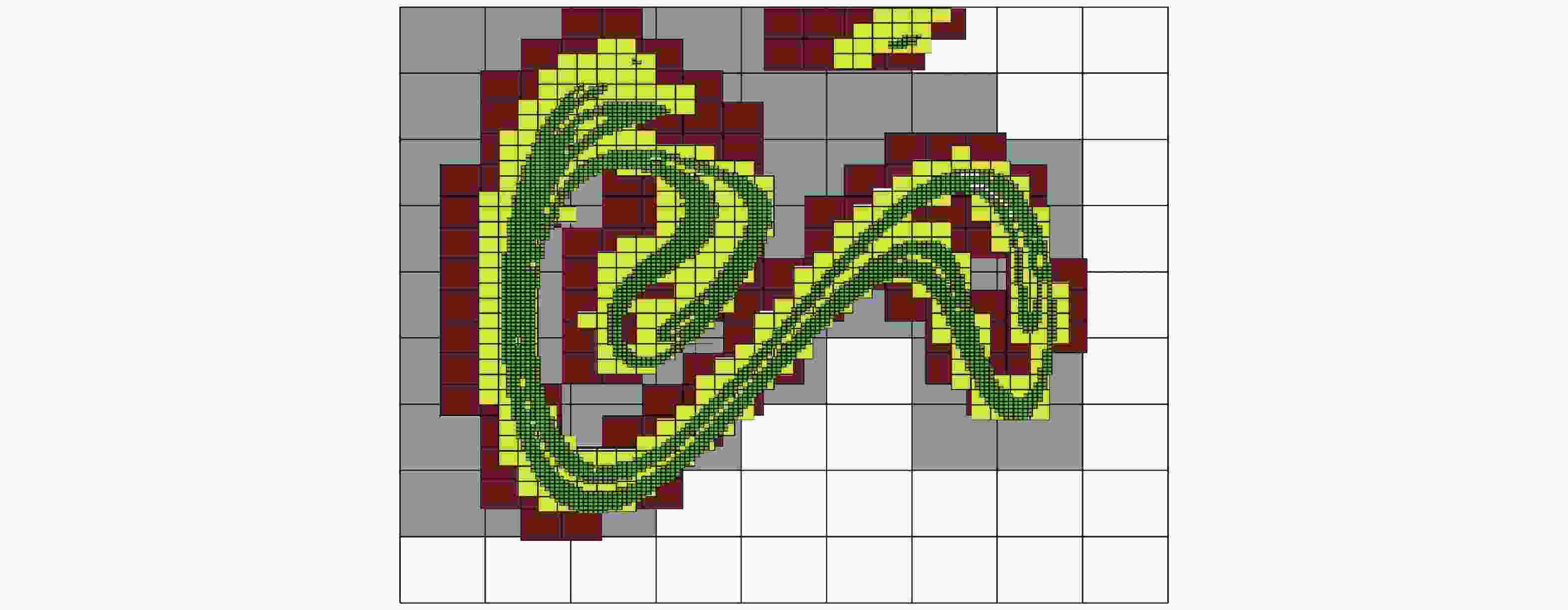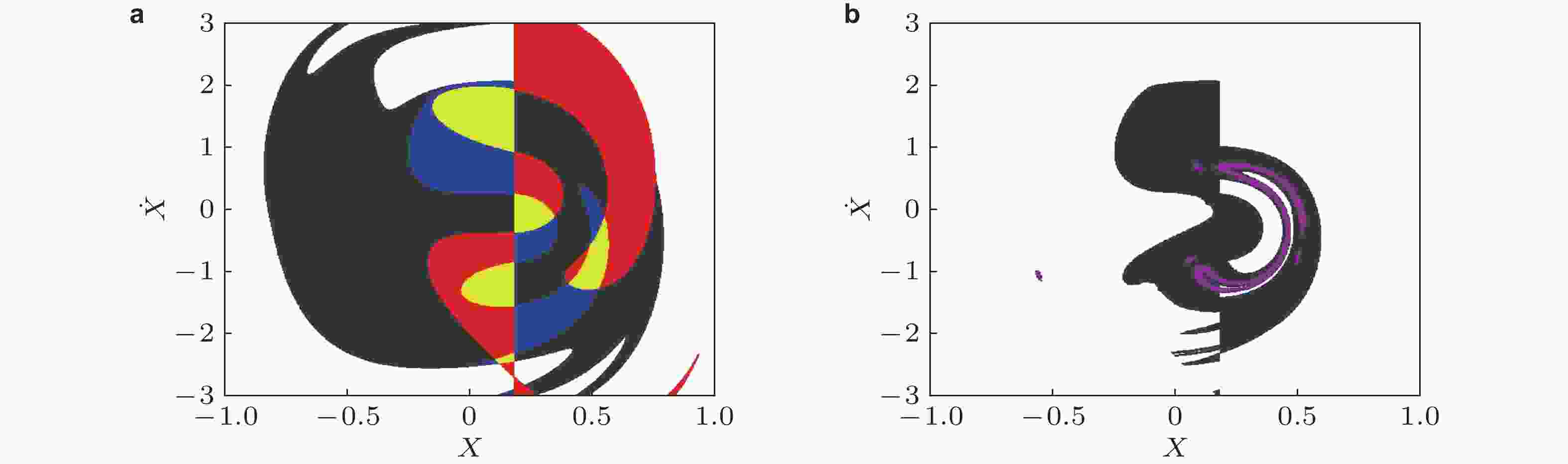 图 6 Mathieu–Duffing系统状态空间子域分割与合成 (空间切分位置为Xd = 0.18)(Li et al. 2019a). (a) 子域划分形成的标记胞; (b) 子域综合后恢复的全局不变集. 其中红色胞为入胞, 蓝色胞为出胞, 黄色胞为相交胞, 深灰色胞为子域内的瞬态胞, 紫色为恢复后的全局不变集结构