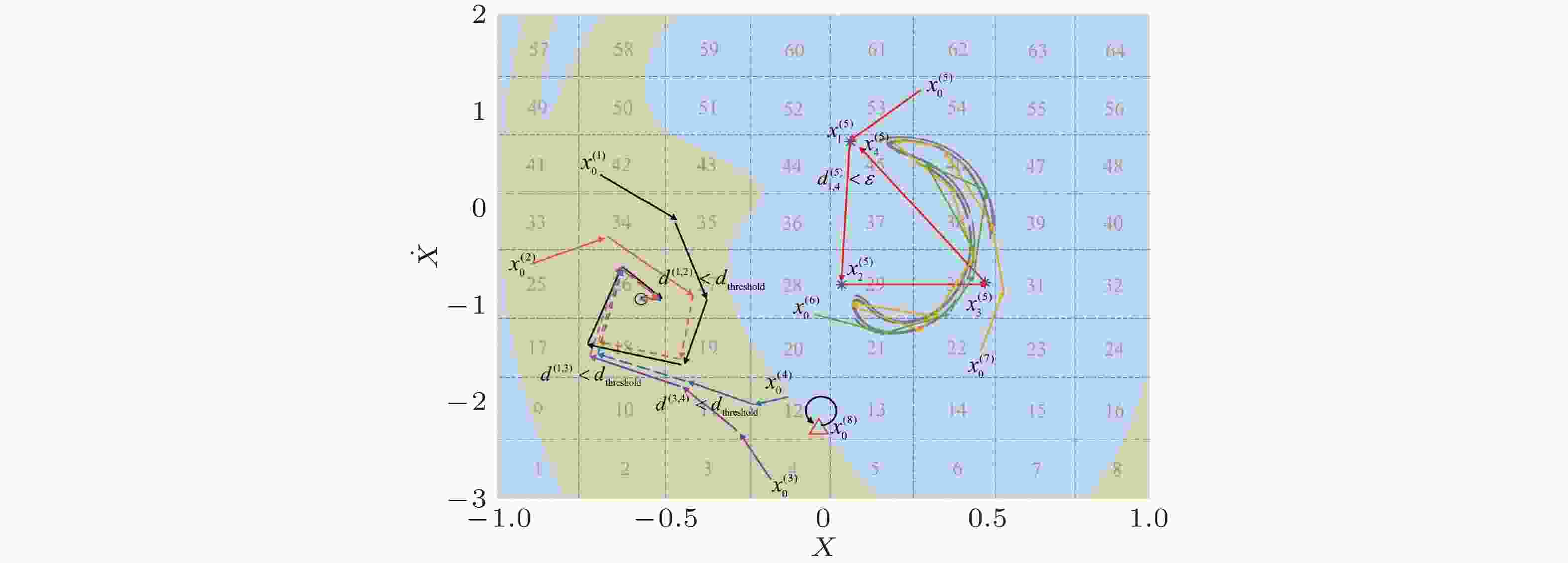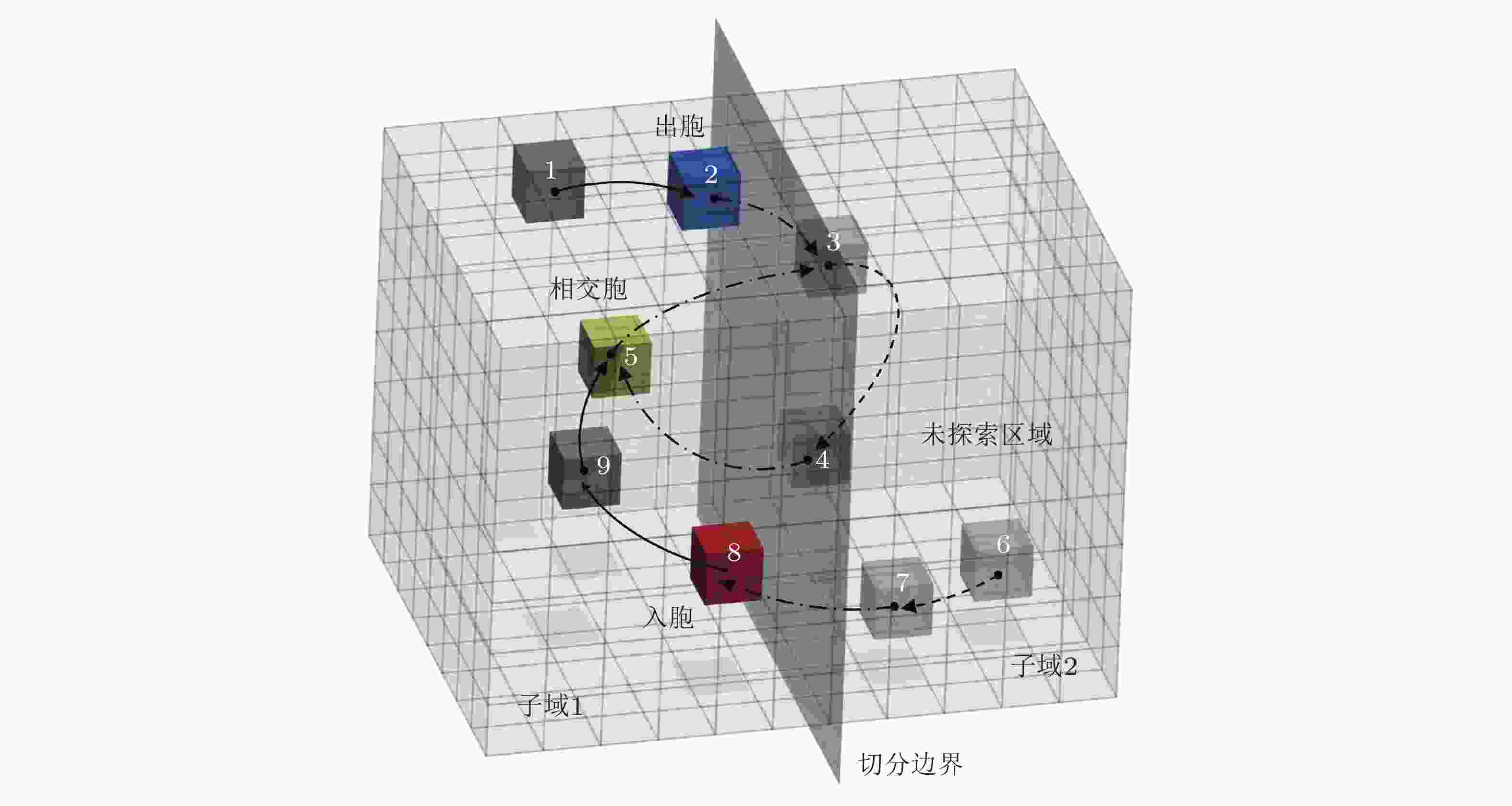 图 5 PSSCM方法的子域划分方式和虚拟不变集(Li et al. 2022). 其中红色胞{8}代表入胞, 蓝色胞{2}代表出胞, 黄色胞{5}代表相交胞, 深灰色胞集合{1,9}是待处理子域1内的瞬态胞, 浅灰色胞集合{6,7}是待处理子域外的潜在 (未知) 转移胞. 集合{5,8,9}即为子域1内的虚拟不变集, 它是跨子域不变集{3,4,5}在子域1中的覆盖集