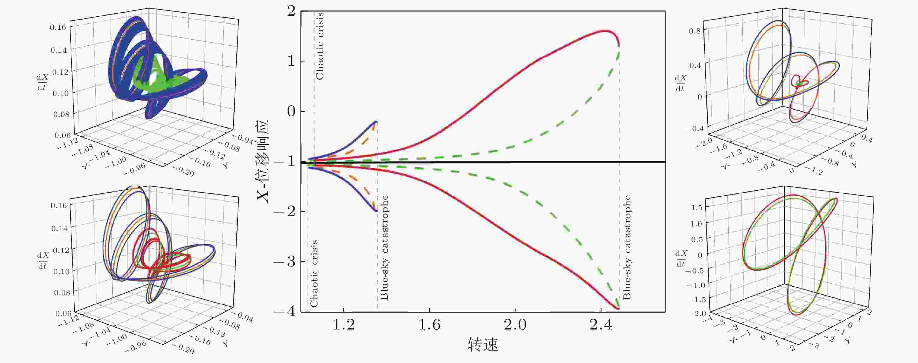 $x_m^{(i)}$ 表示第i条轨迹的第m个映射状态点, 网格和数字代表胞的区间和编码, 浅黄和浅蓝区域分别对应周期1 (“○”) 和周期3 (“*”) 两个吸引子的全局吸引域, 浅灰色结构为周期3吸引域内部的鞍性混沌, 边界上“△”为不稳定鞍点. 当第j条轨迹进入第i条轨迹的“已访问”胞且触发$ {d^{(i,j)}} \lt {d_{{\text{threshold}}}} $ , 则后续轨迹无需计算 (彩色虚线) 并更新相应的$ R(Z) $ ; 当第i条轨迹的第n个映射状态点再次进入该条轨迹的“访问中”胞且与第m个映射状态点触发$ d_{m,n}^{(i)} \lt \varepsilon $ 时, 则标记该轨迹的周期性并更新相应的$ R(Z) $ 图 4 转子/定子碰摩系统的全局结构和动力学分岔(Fan et al. 2022). 其中左图为诱发两种间歇性准周期碰摩行为发生的混沌激变, 右图为导致两种间歇性准周期碰摩行为消亡的突变分岔, 中图为上述现象发生、发展和消亡的动力学分岔图